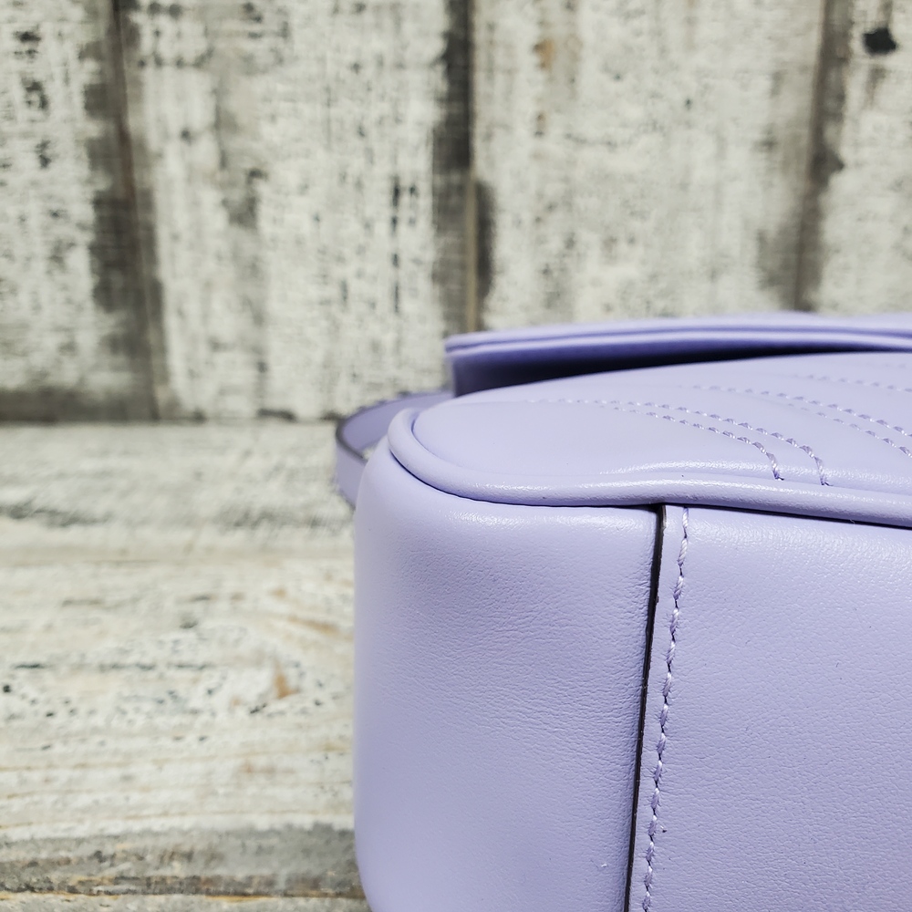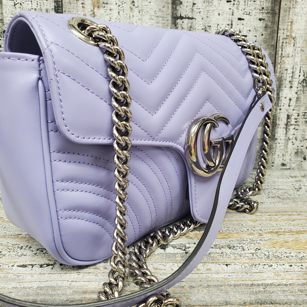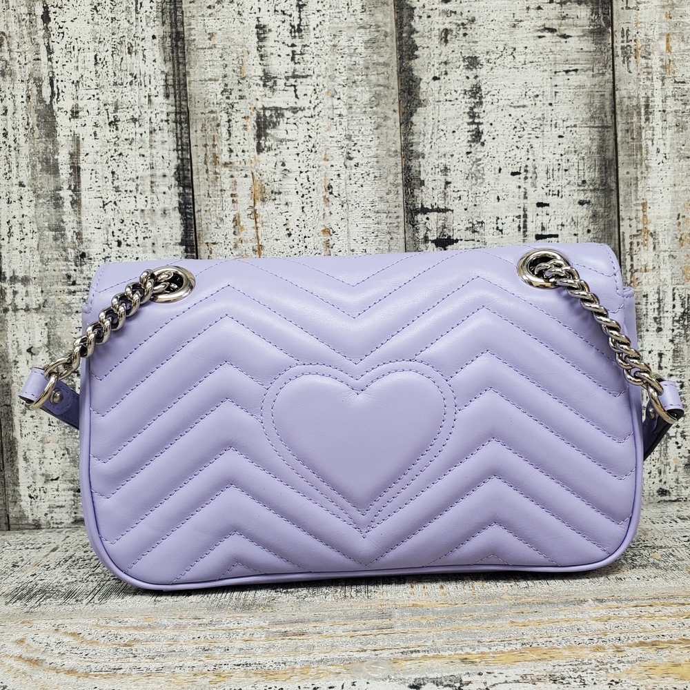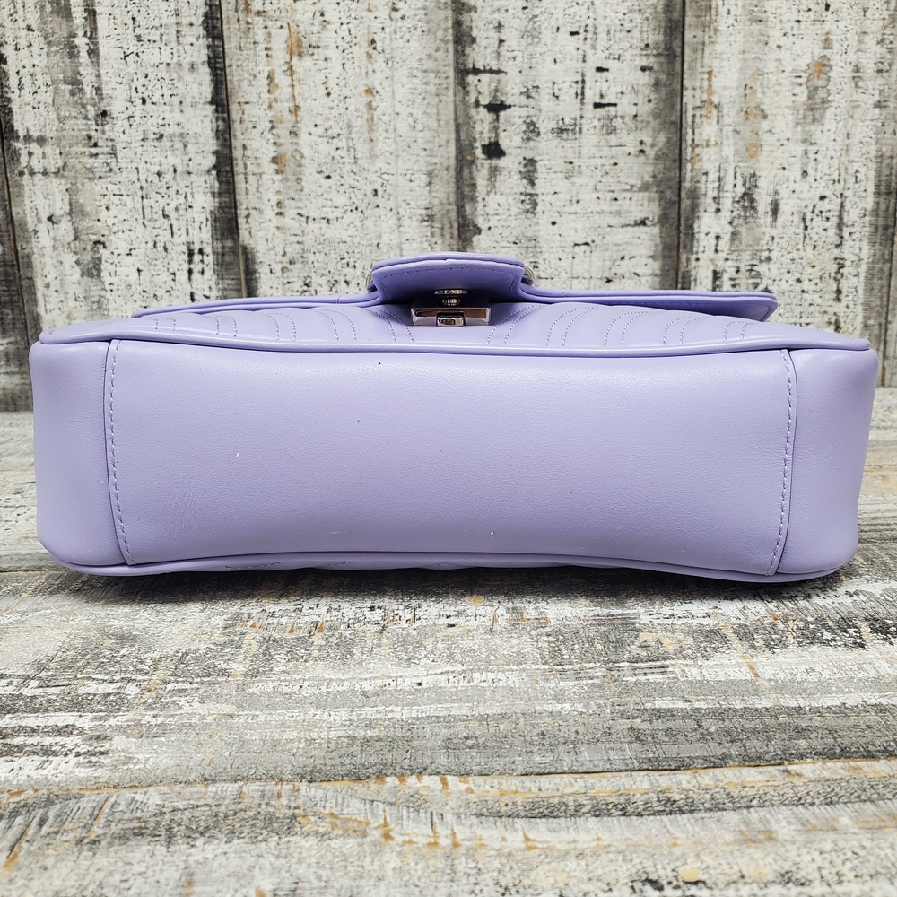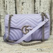 A stylish, Pre-owned Gucci GG Marmont women's shoulder bag, crafted from a premium cotton blend with distinctive features, perfect for a luxurious fashion statement.
