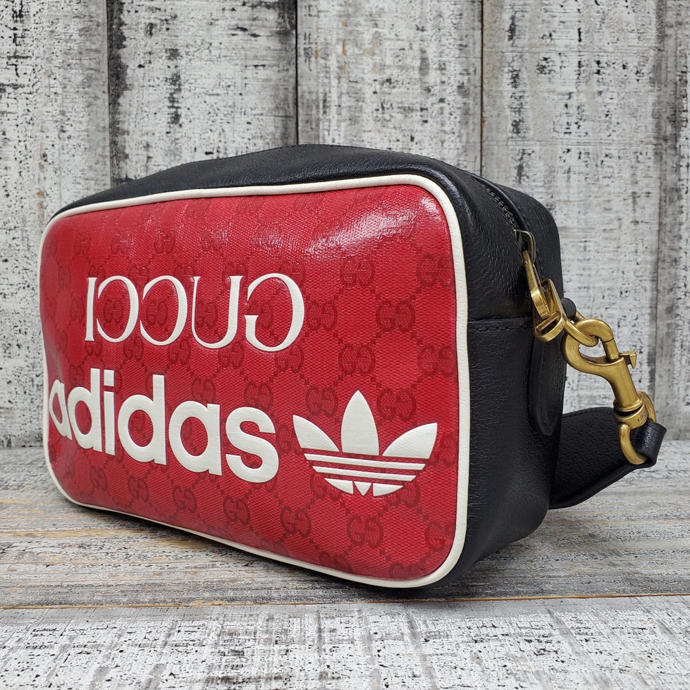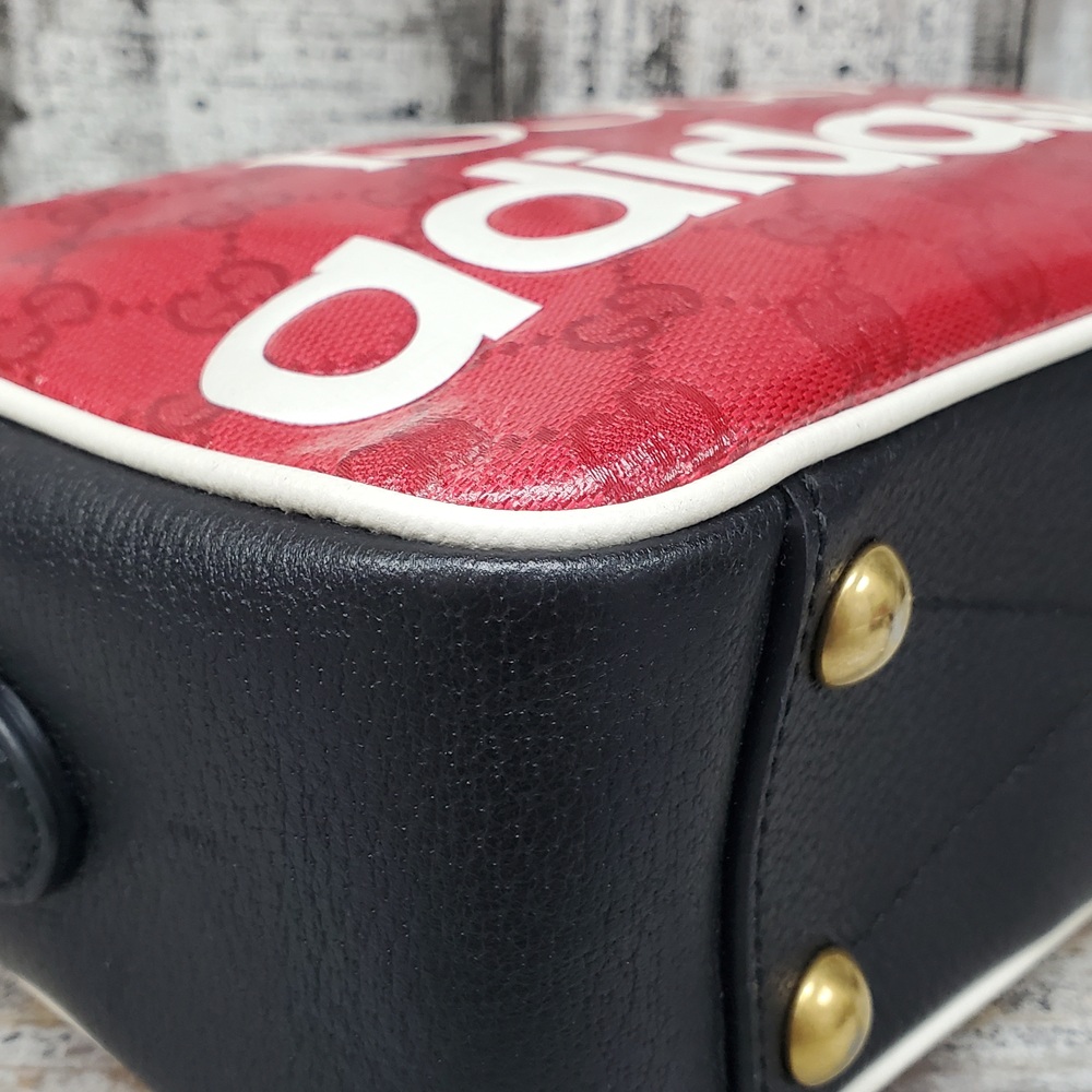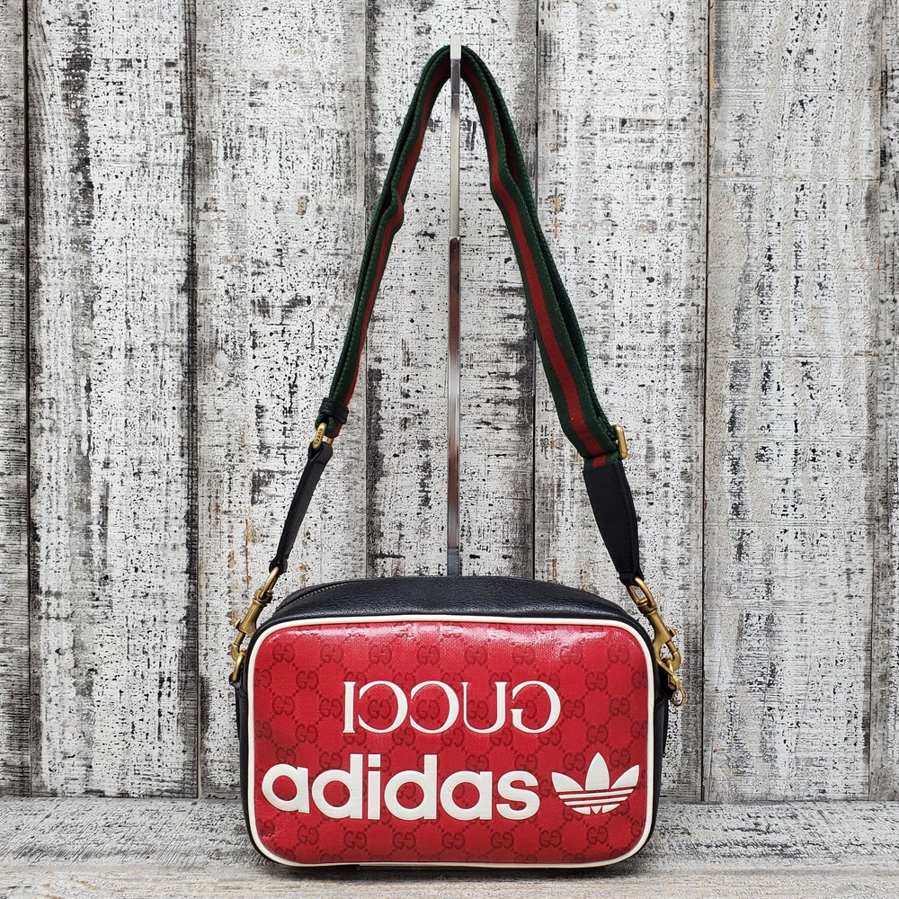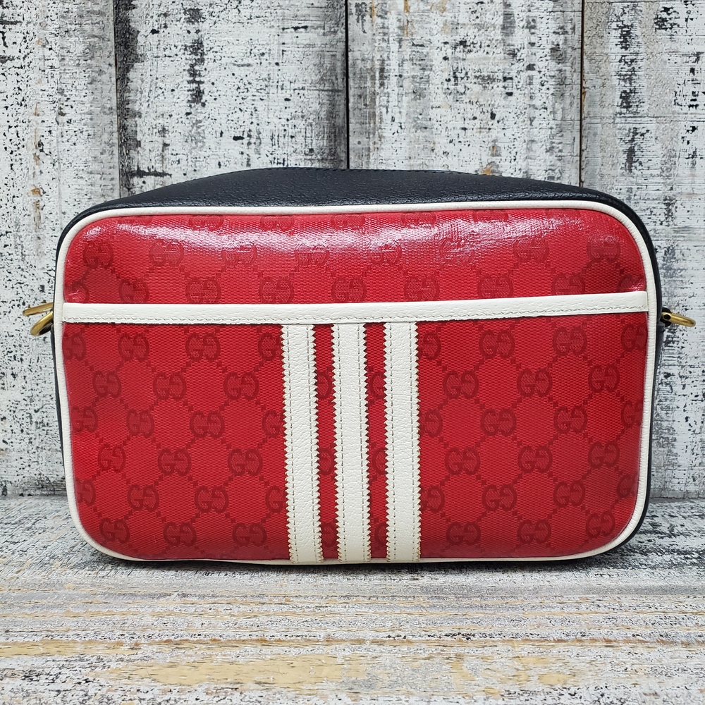 A stylish, vintage-inspired messenger bag featuring a combined Gucci and Adidas monogram design decorated with crystal detailing. Made from high-quality textured dollar calfskin with a classic web trefoil logo. A versatile, chic accessory for fashion enthusiasts.