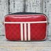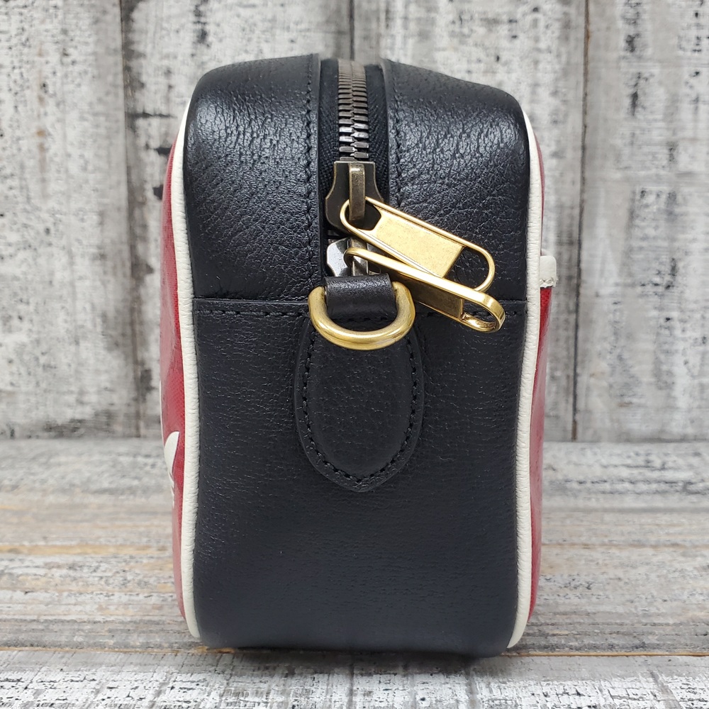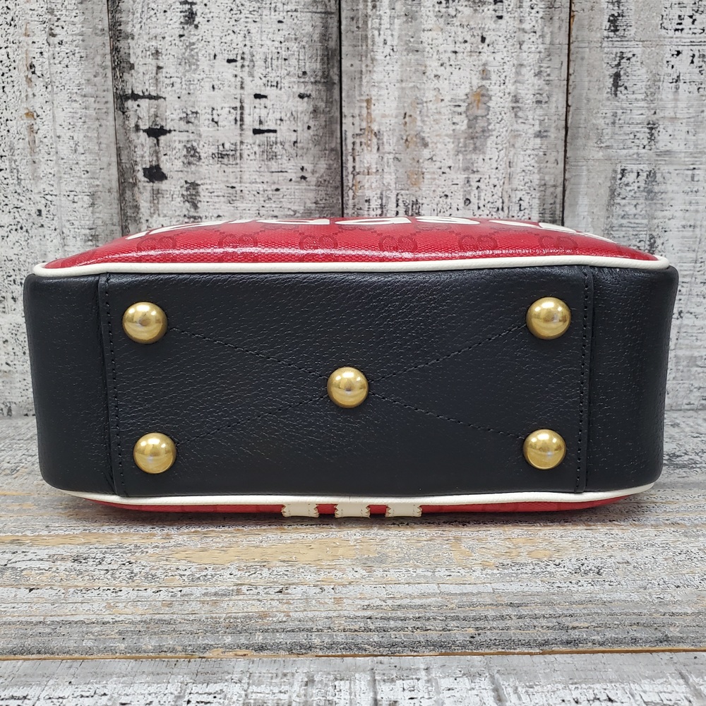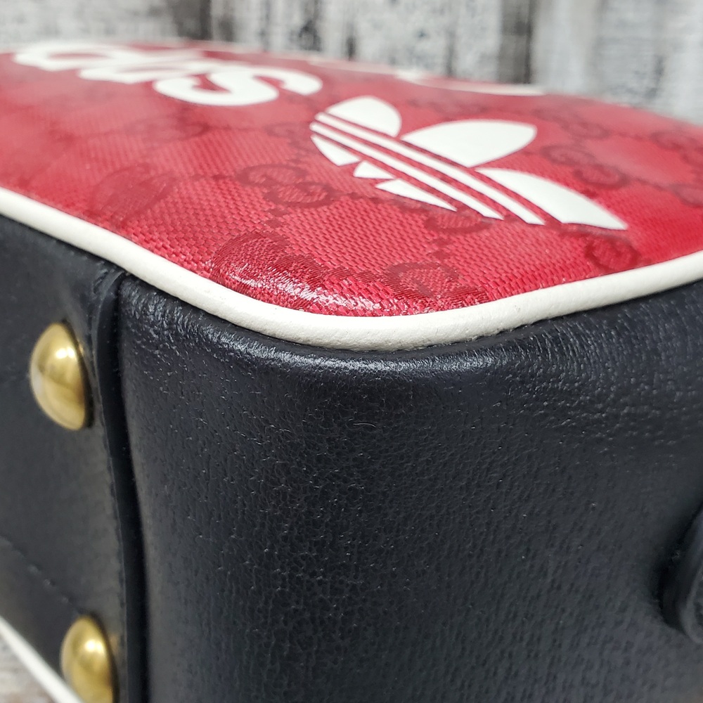 A stylish, vintage-inspired messenger bag featuring a combined Gucci and Adidas monogram design decorated with crystal detailing. Made from high-quality textured dollar calfskin with a classic web trefoil logo. A versatile, chic accessory for fashion enthusiasts.
