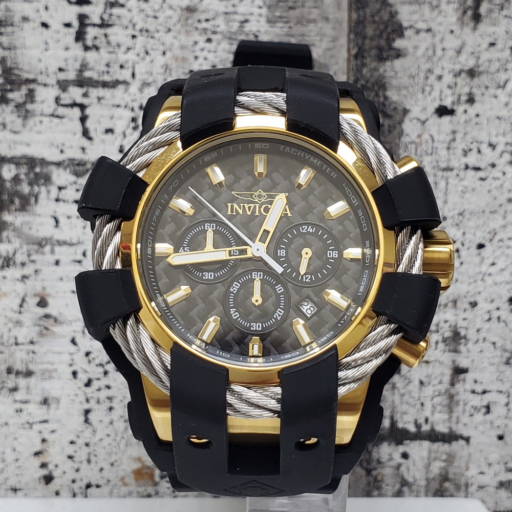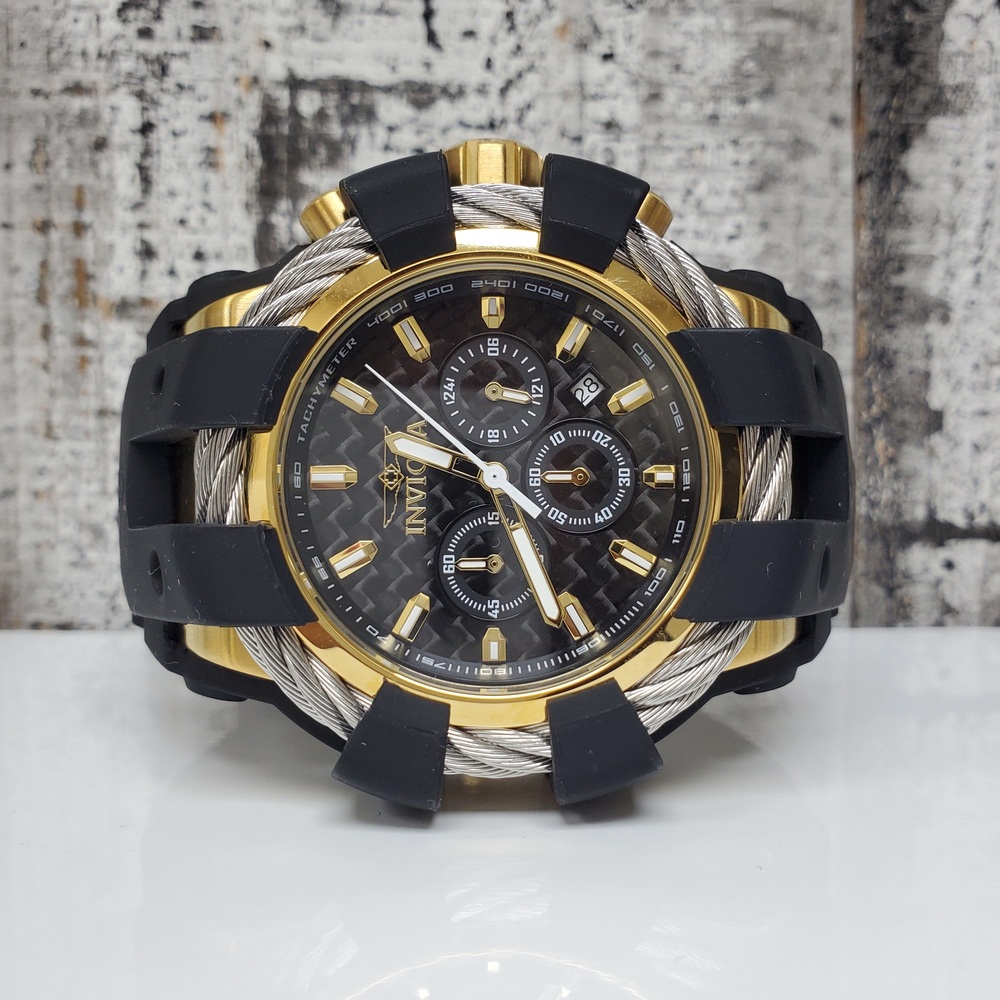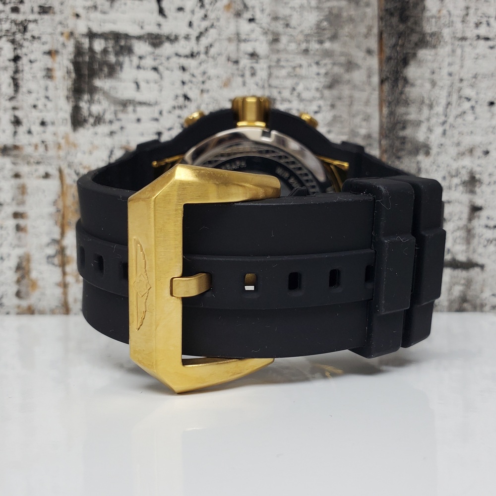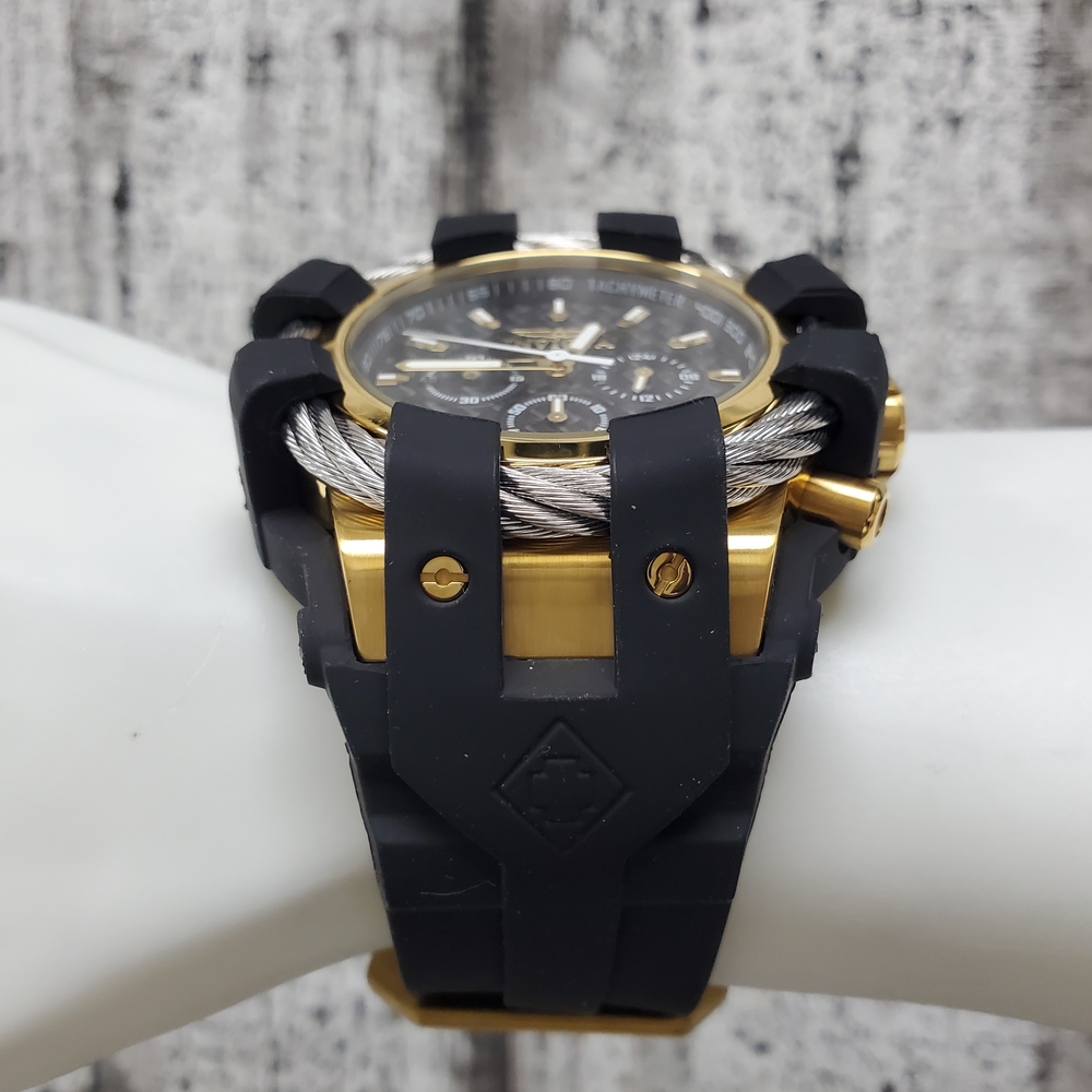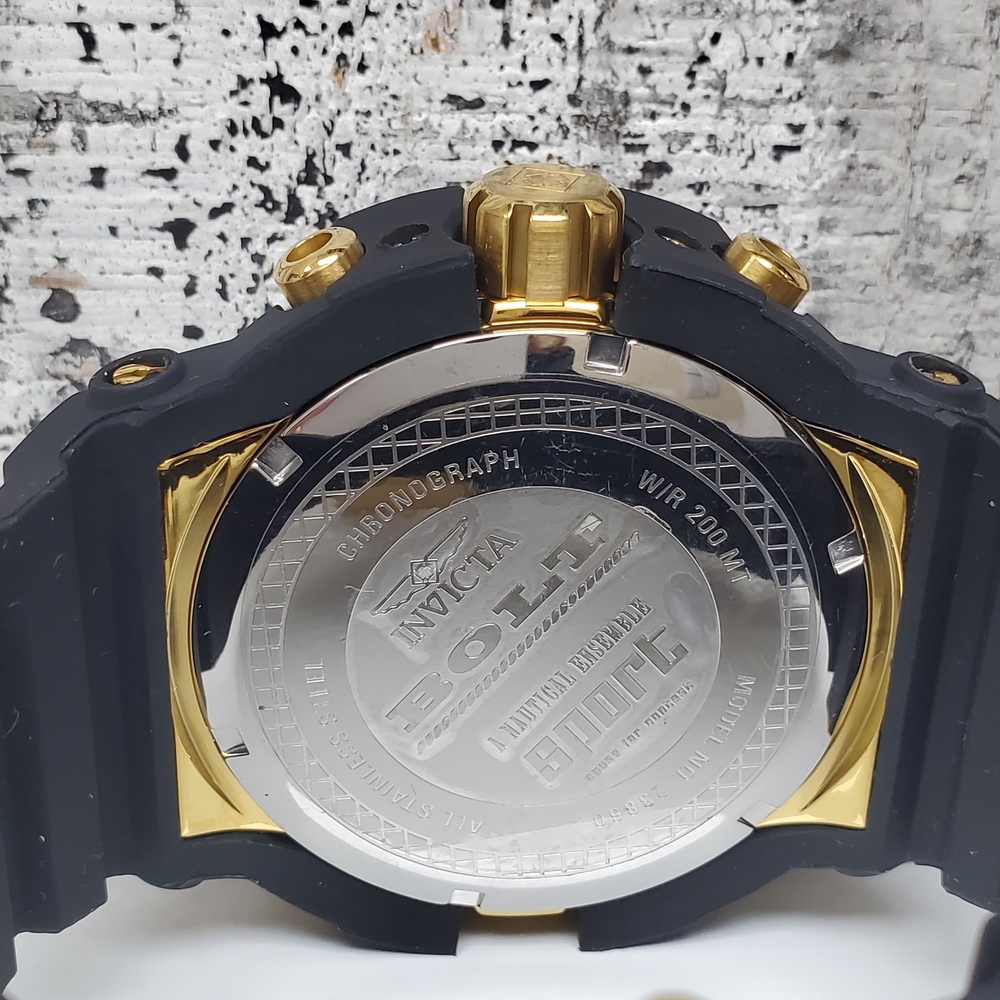 A gold tone Invicta 23860 Bolt Sport watch with a black rubber strap and stainless steel features, showing minor signs of prior use.