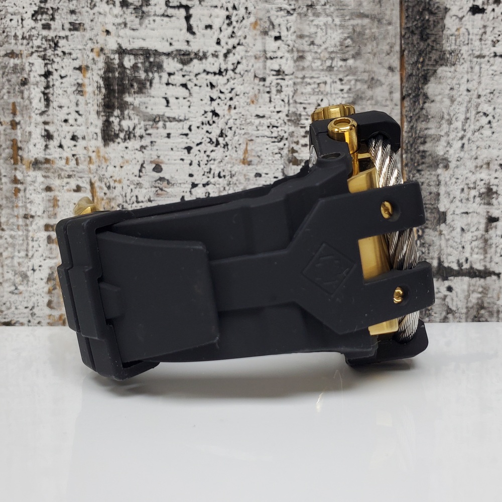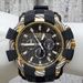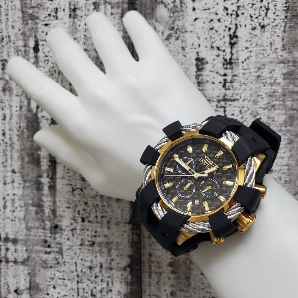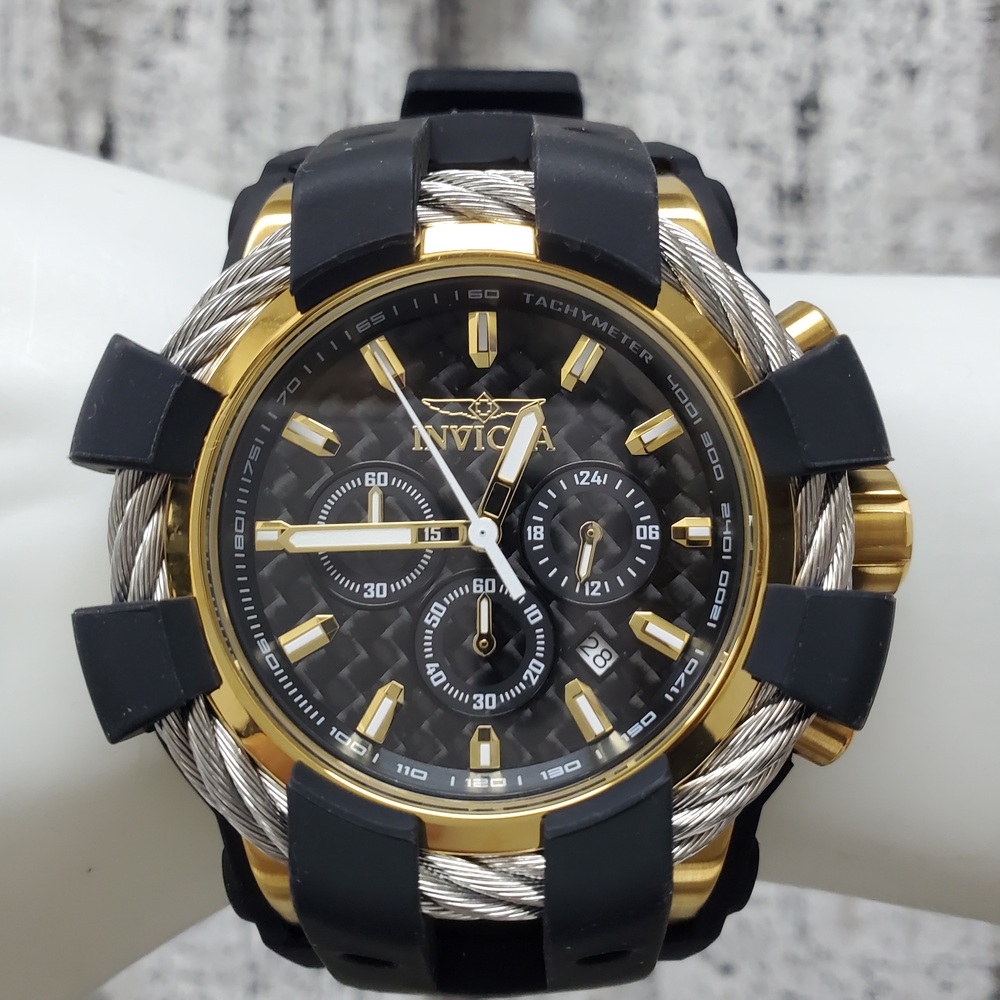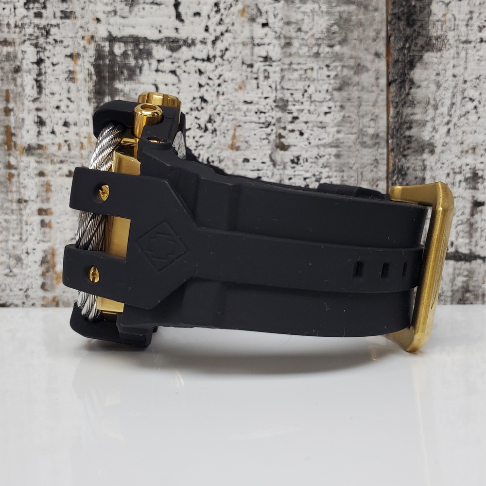 A gold tone Invicta 23860 Bolt Sport watch with a black rubber strap and stainless steel features, showing minor signs of prior use.