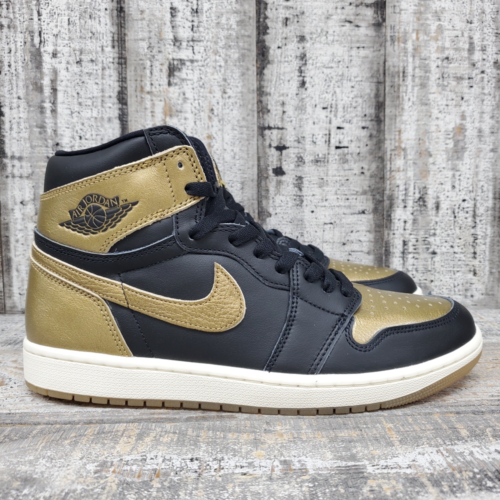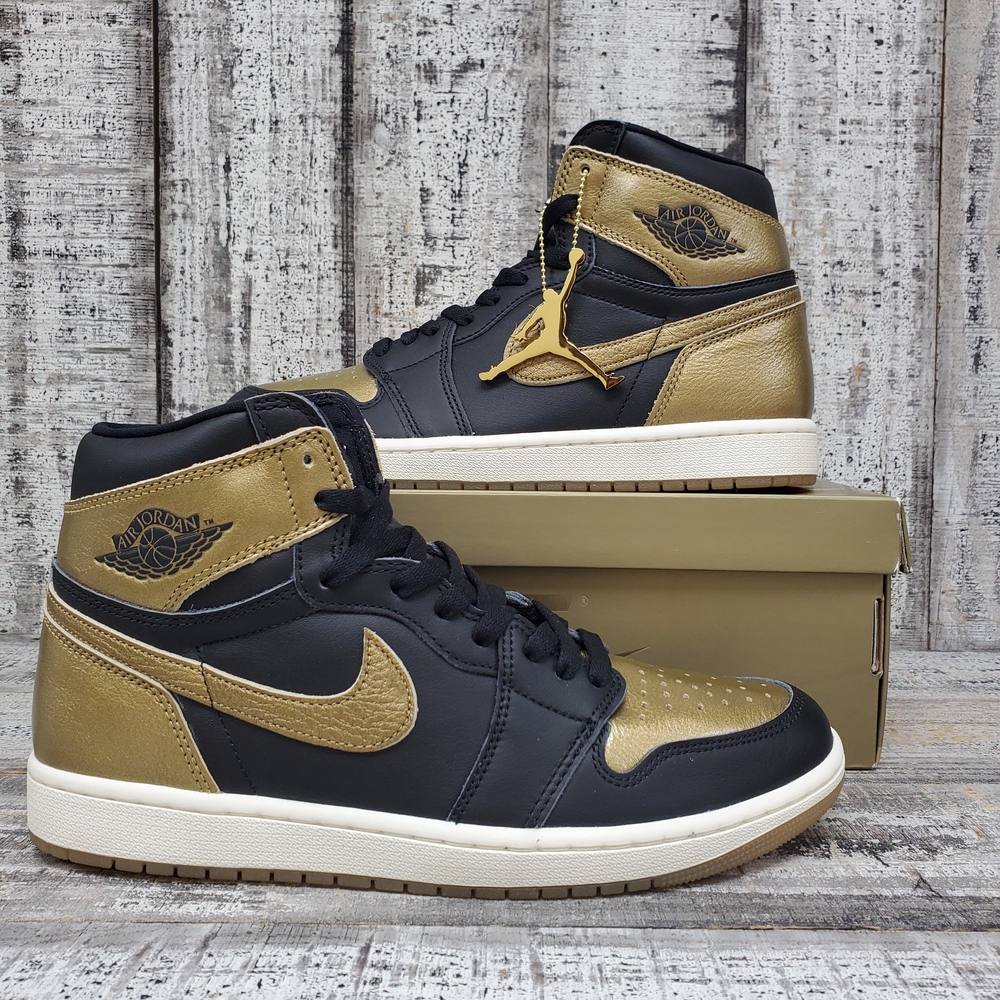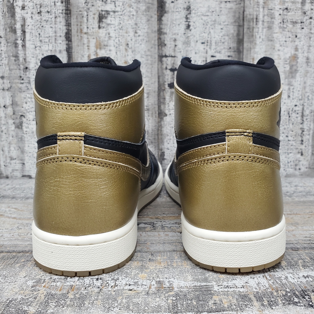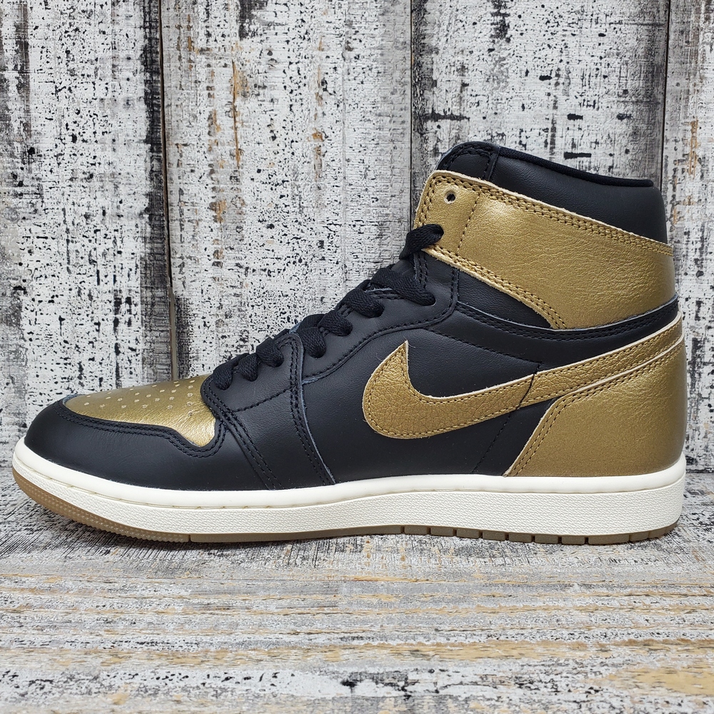 A size 10 Jordan 1 Retro High OG in Black Metallic Gold with original box. Iconic design, prime comfort, stylish appeal. Ideal for sneaker enthusiasts.