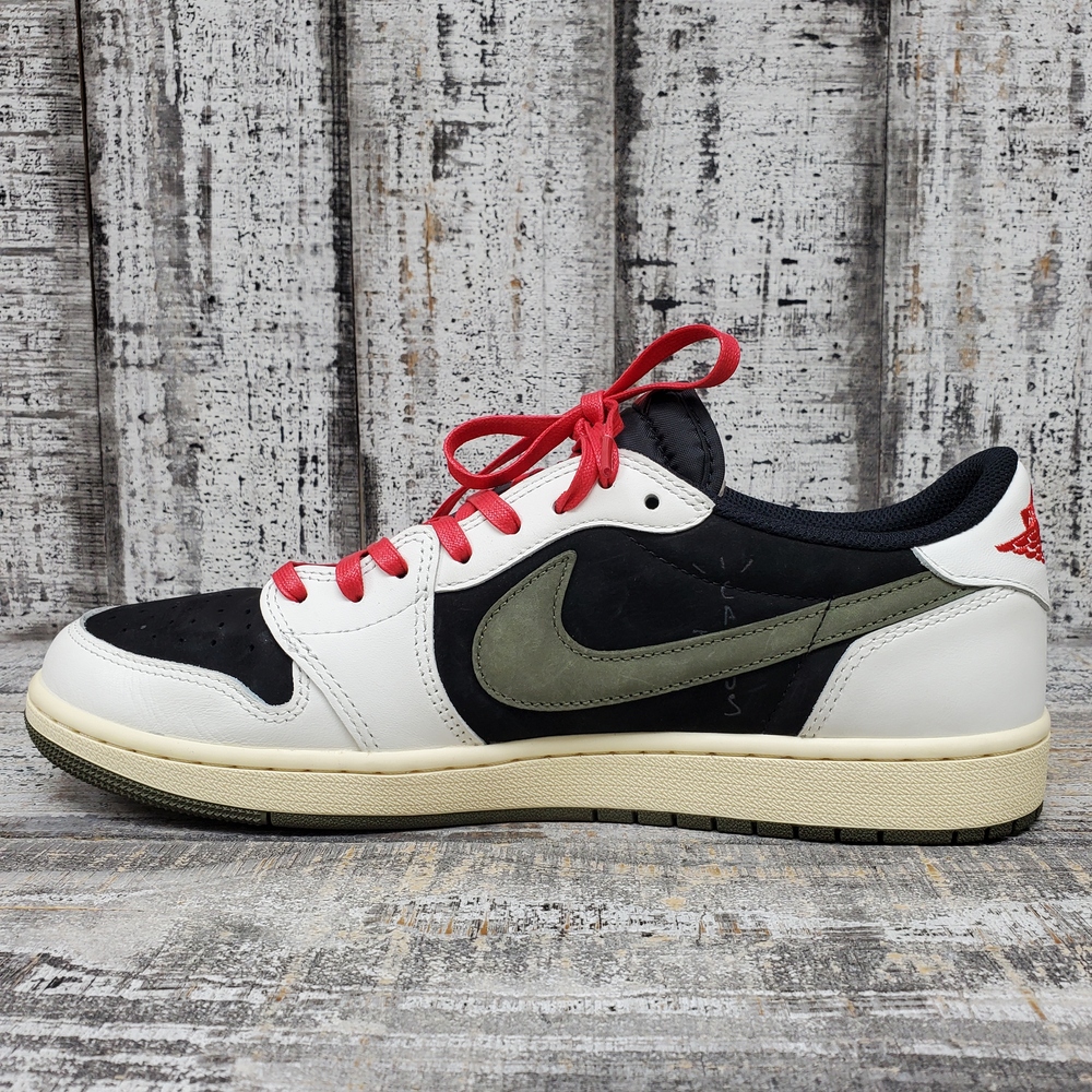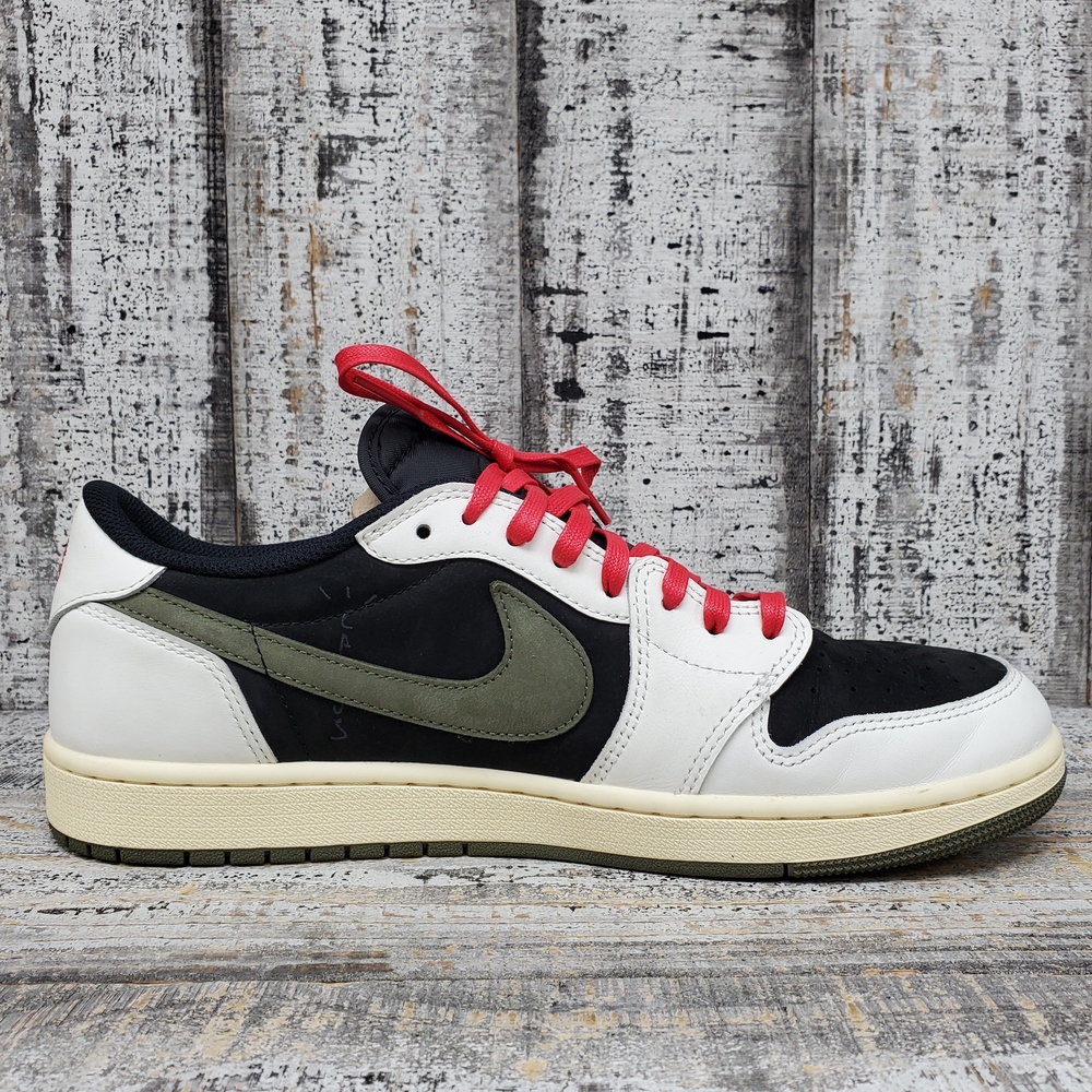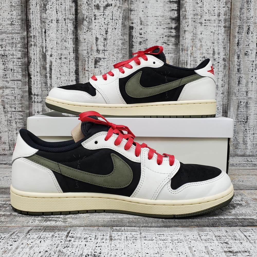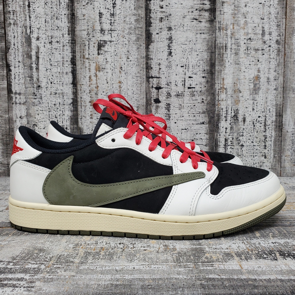 Like new Jordan 1 Travis Scott Low Olive, size 12M/13.5W, in box. Unisex, stylish, with signature detailing. Perfect for sneaker collectors or casual wear.