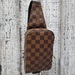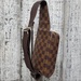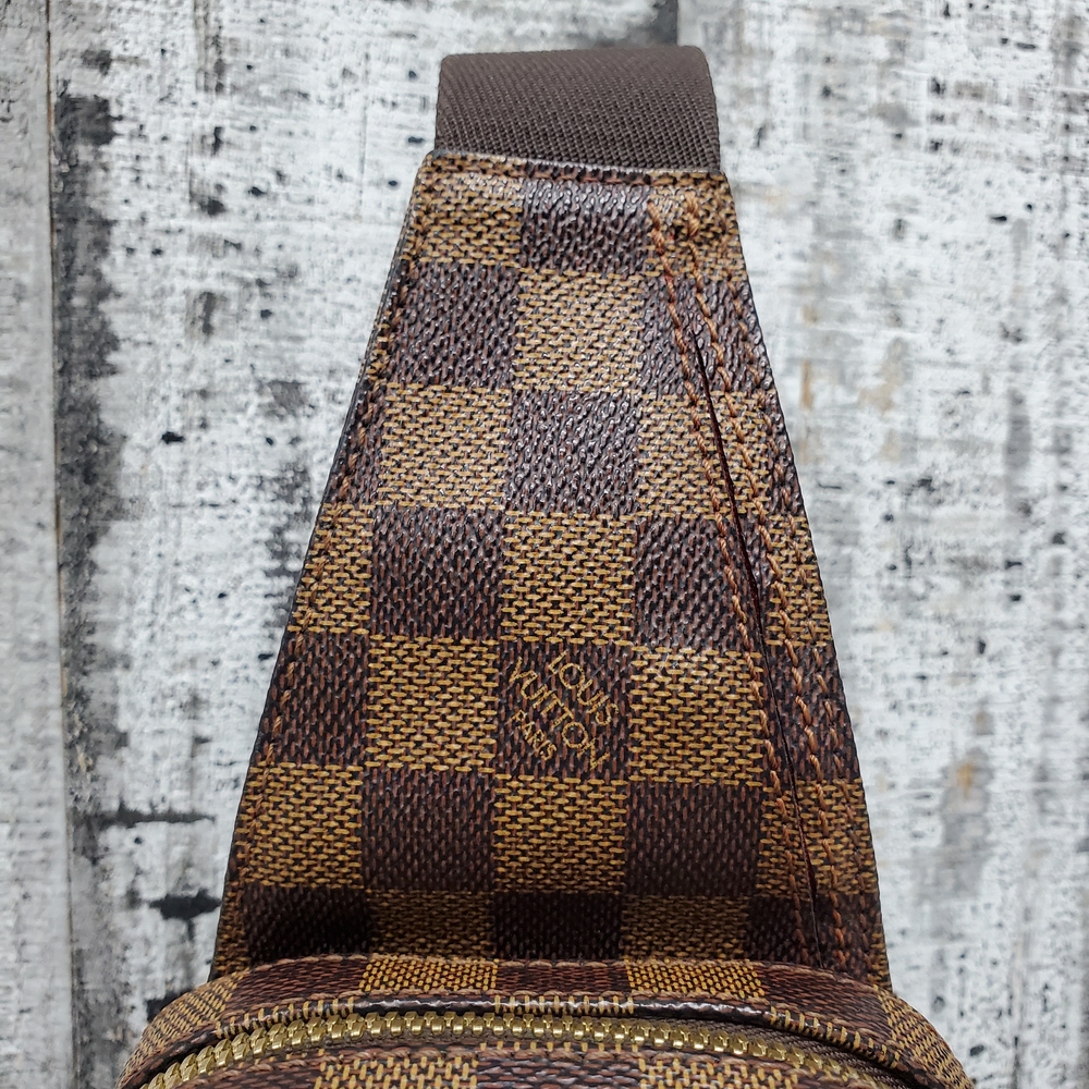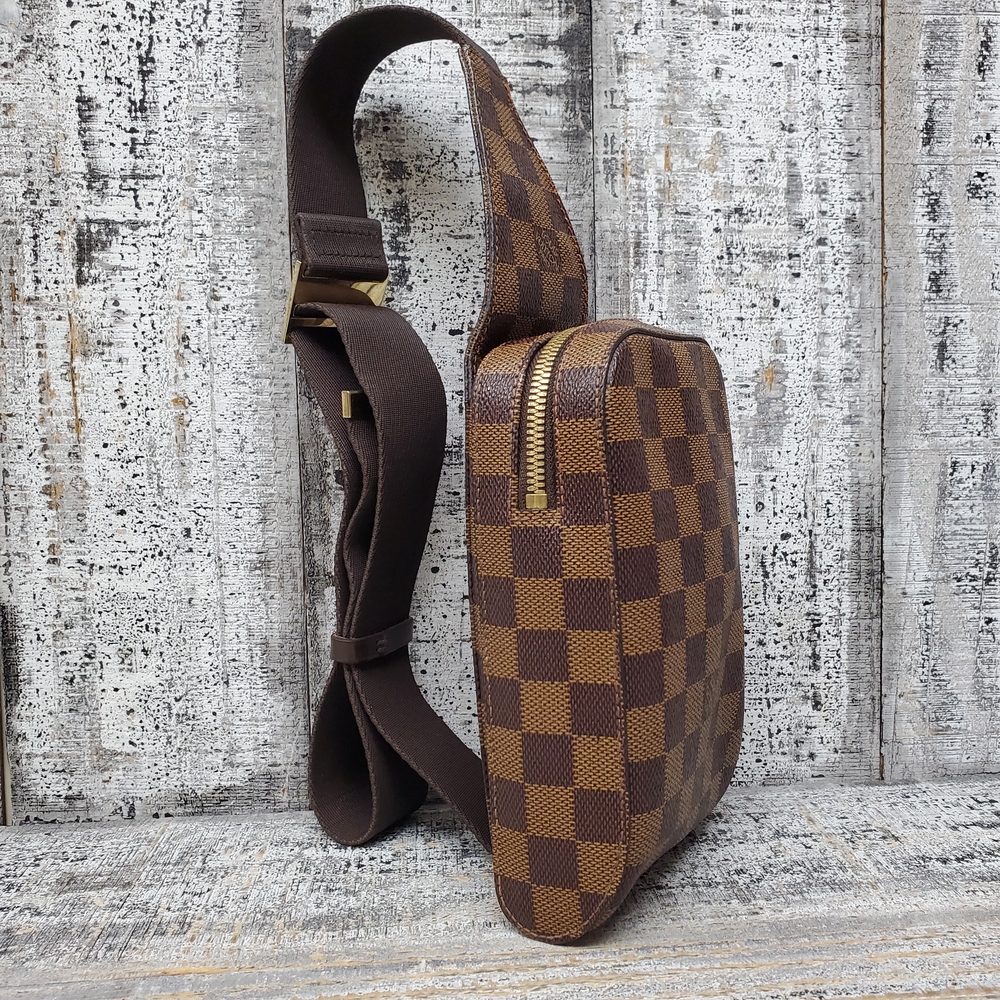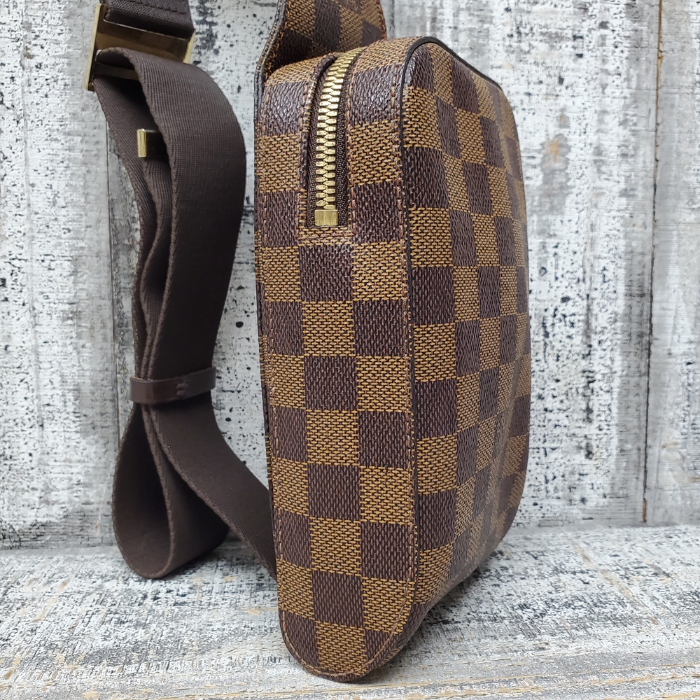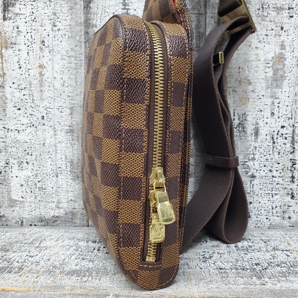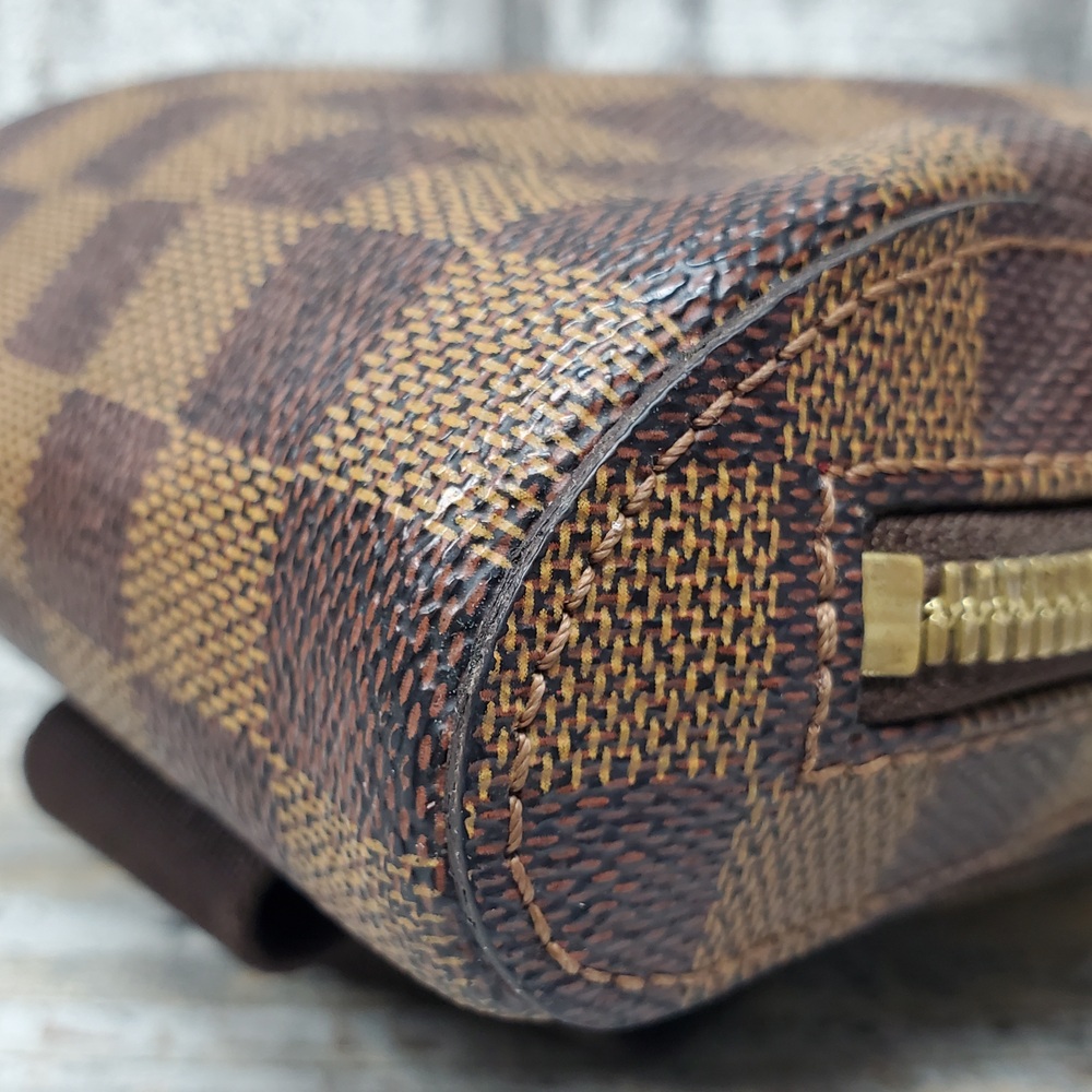 Used Louis Vuitton Damier Ebene Geronimos; exhibits classic check pattern, high-quality craftsmanship, practical design; evidences of wear but maintains its luxurious charm.