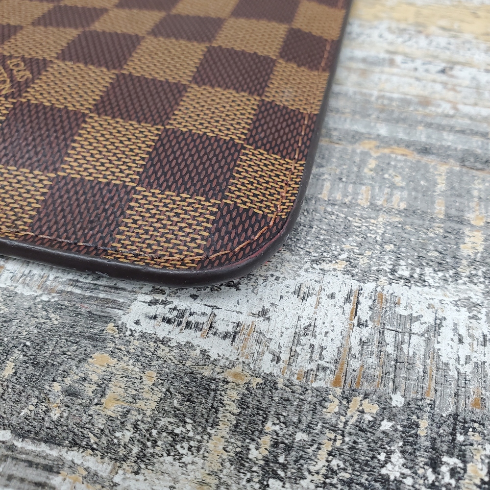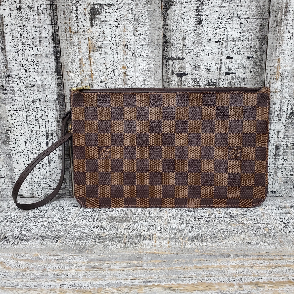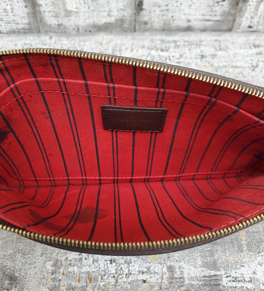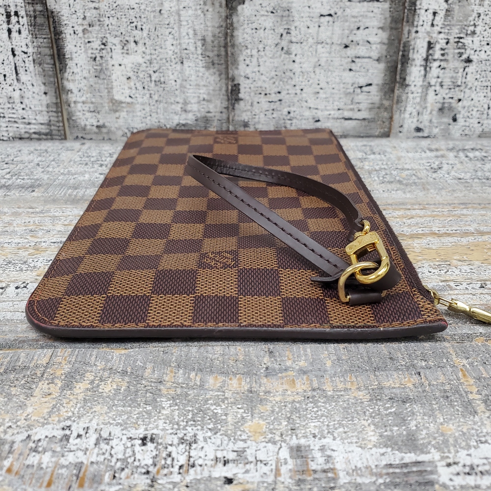 Used Louis Vuitton Damier Ebene Pochette, features iconic design, comes with interior stains, reflecting a worn-in charm. Great for casual and formal styles alike.