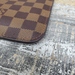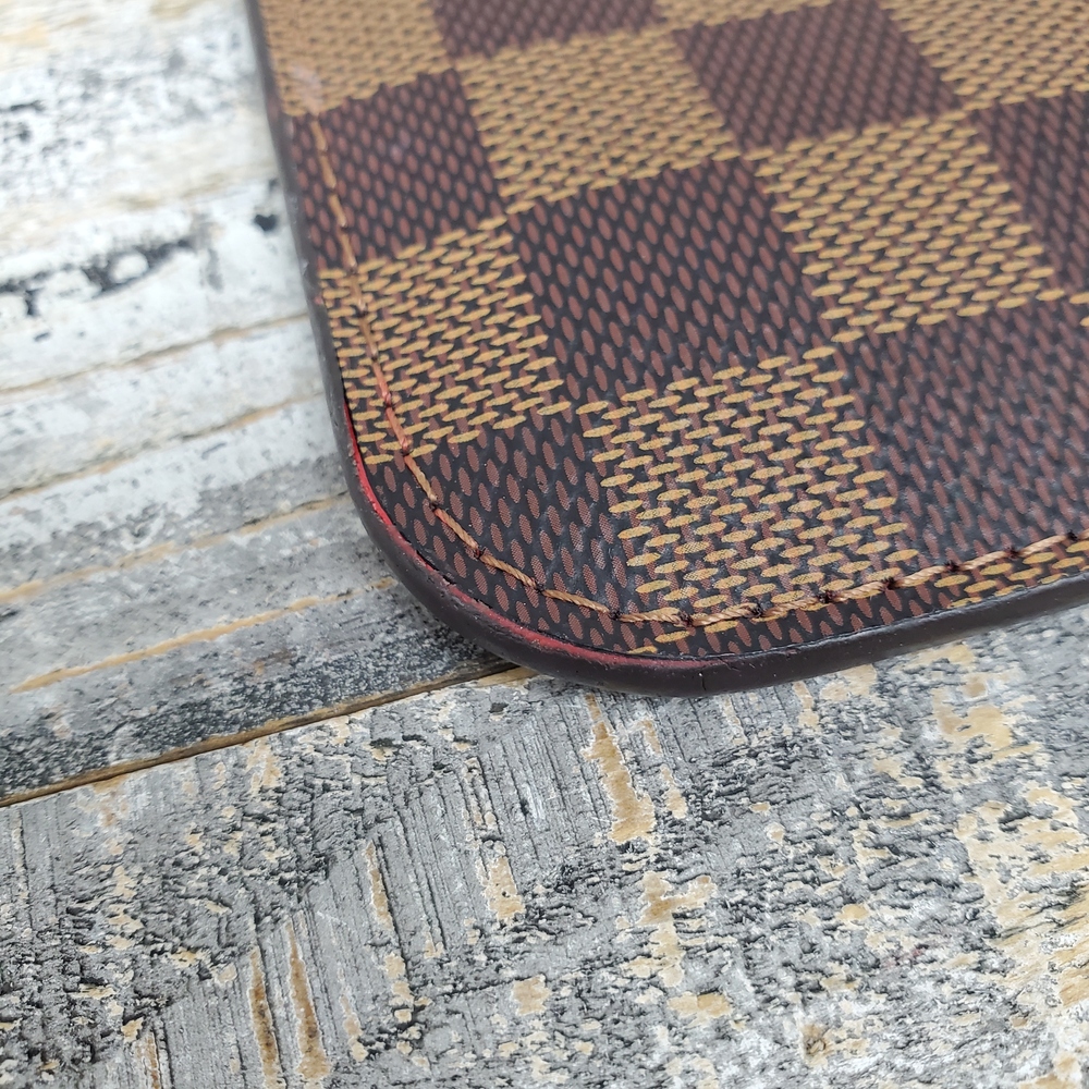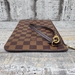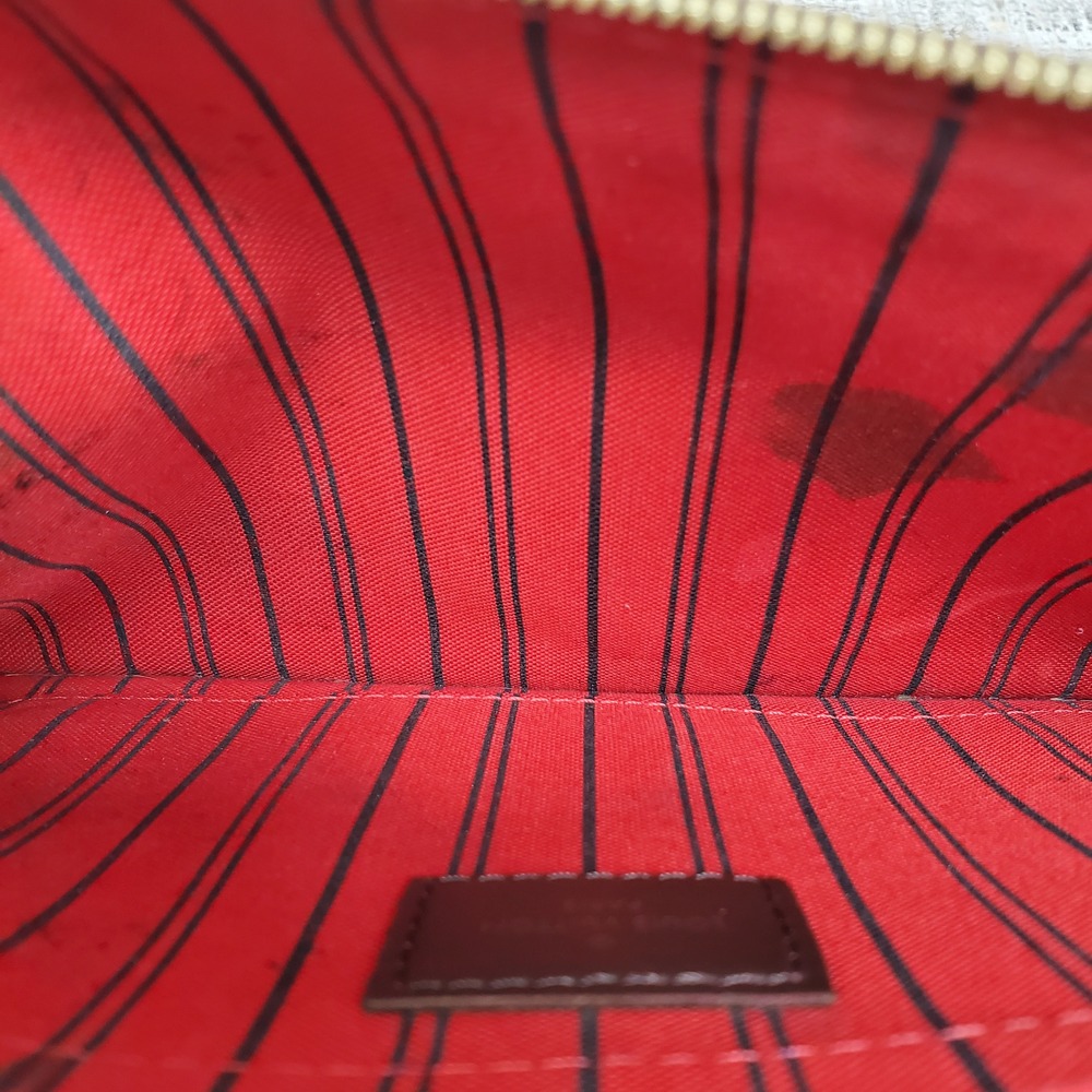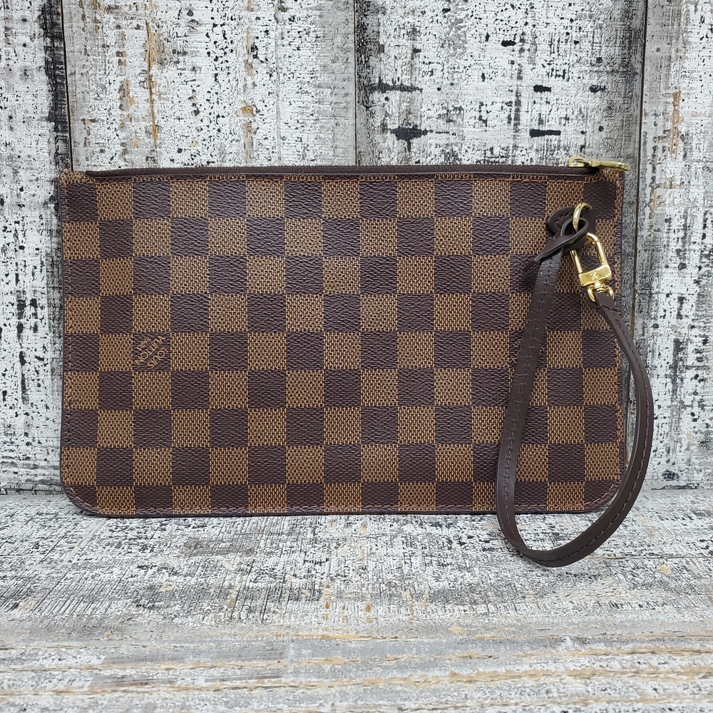 Used Louis Vuitton Damier Ebene Pochette, features iconic design, comes with interior stains, reflecting a worn-in charm. Great for casual and formal styles alike.