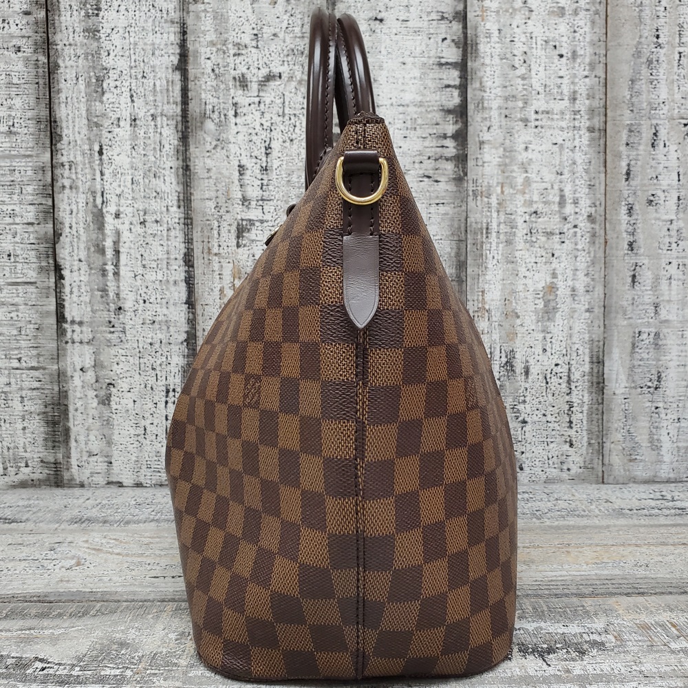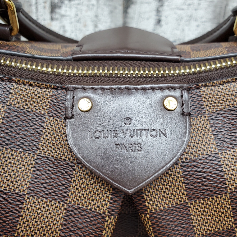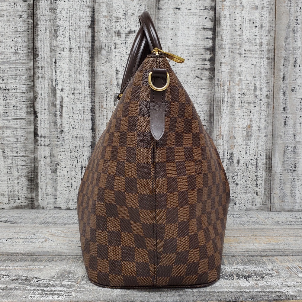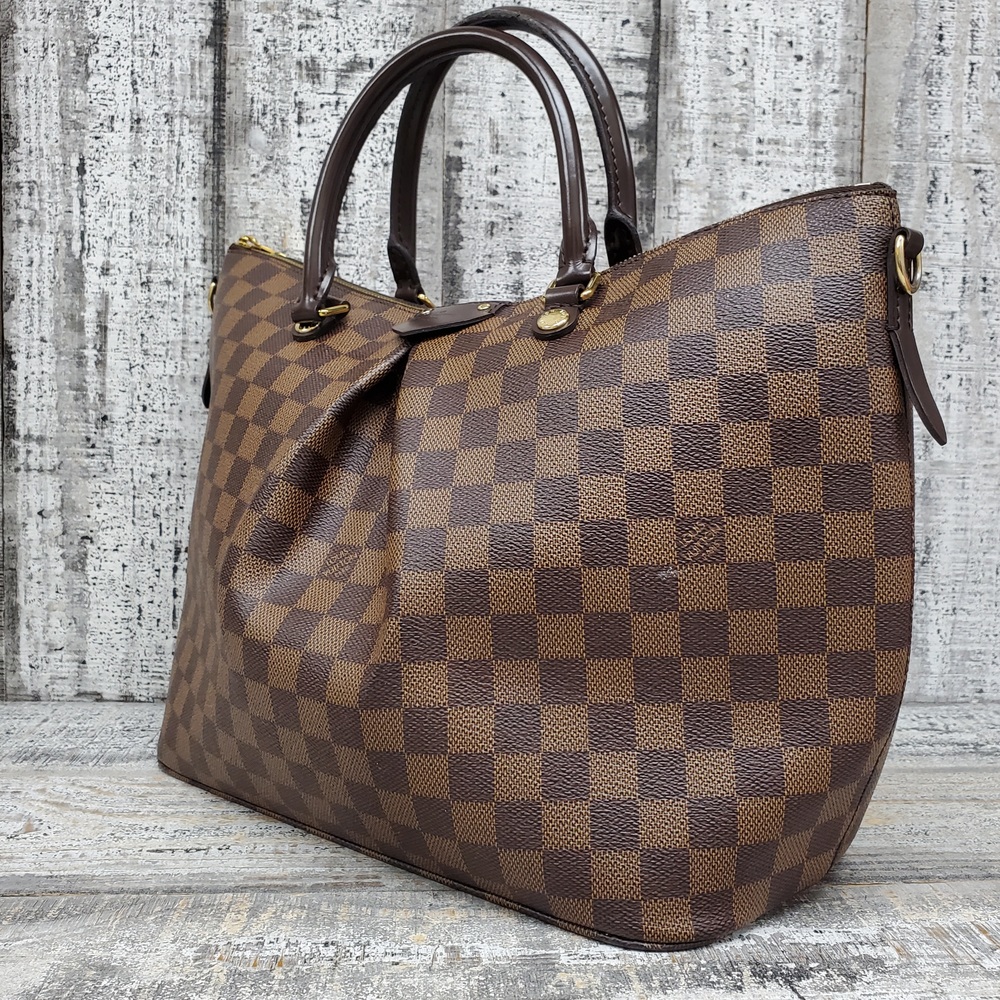 A pre-owned Louis Vuitton Siena MM handbag in Damier Ebene print, featuring classic checkered pattern, versatile brown tones, and premium leather trim.