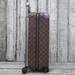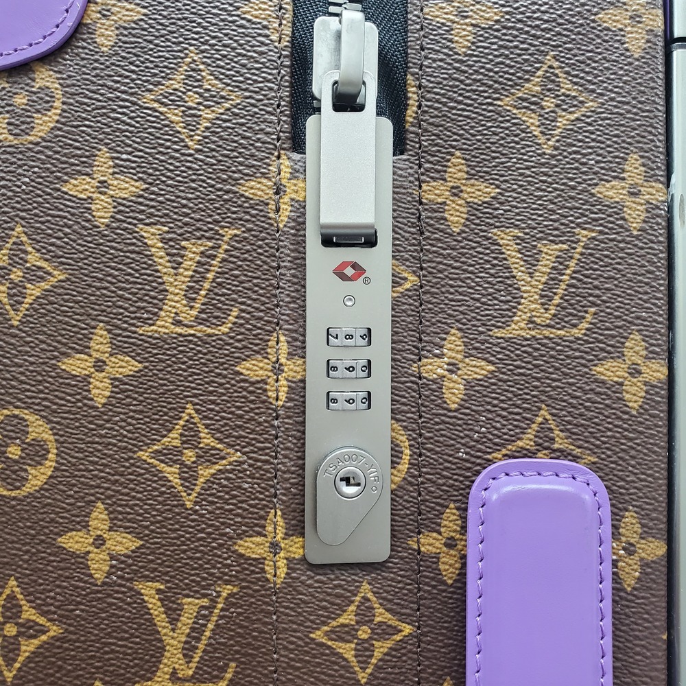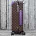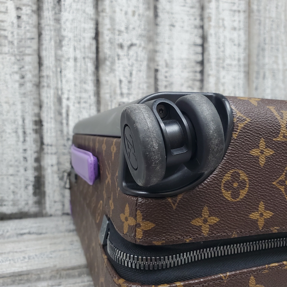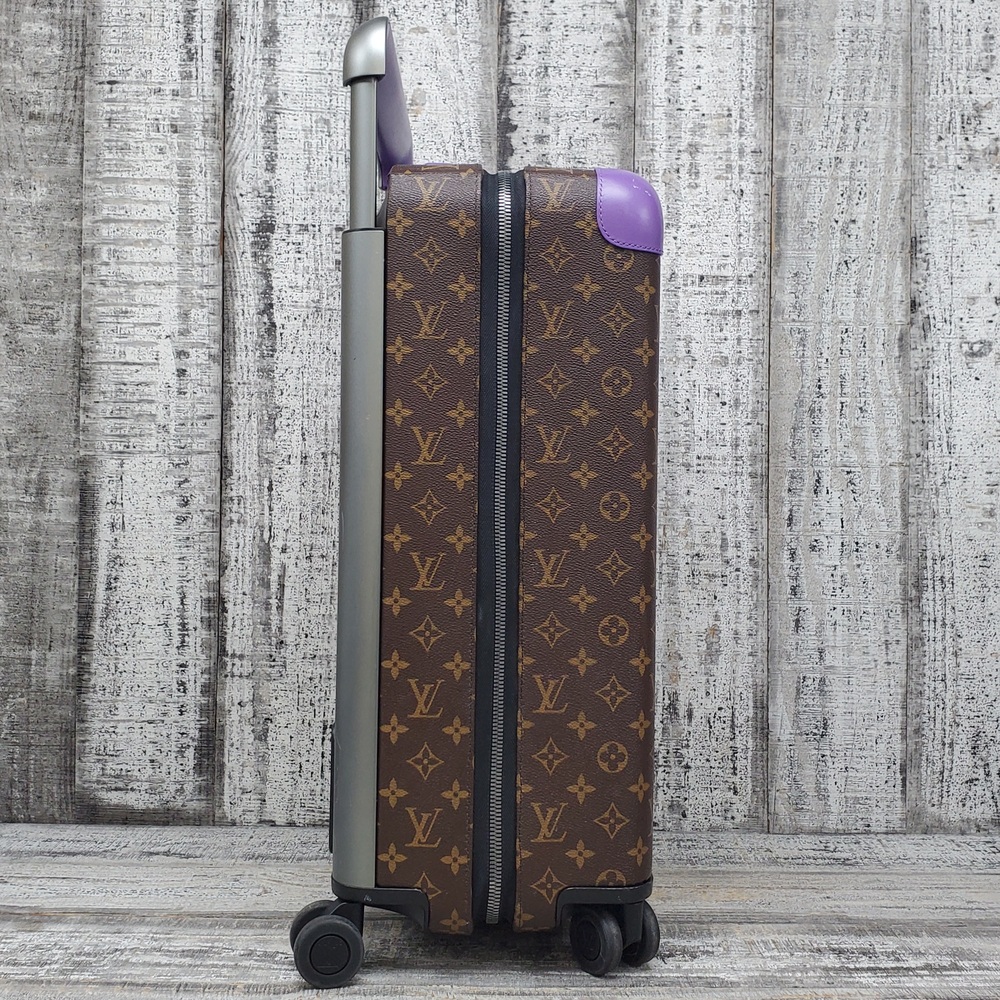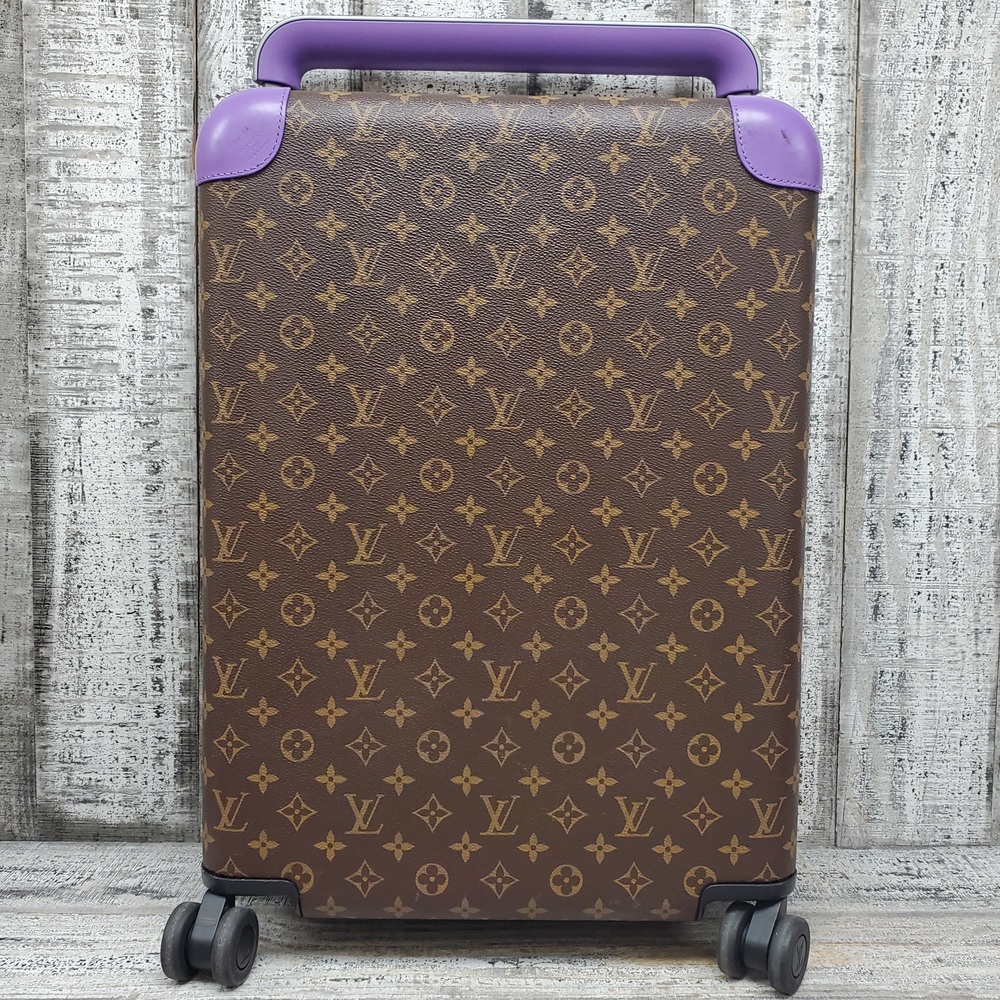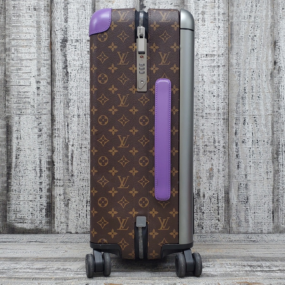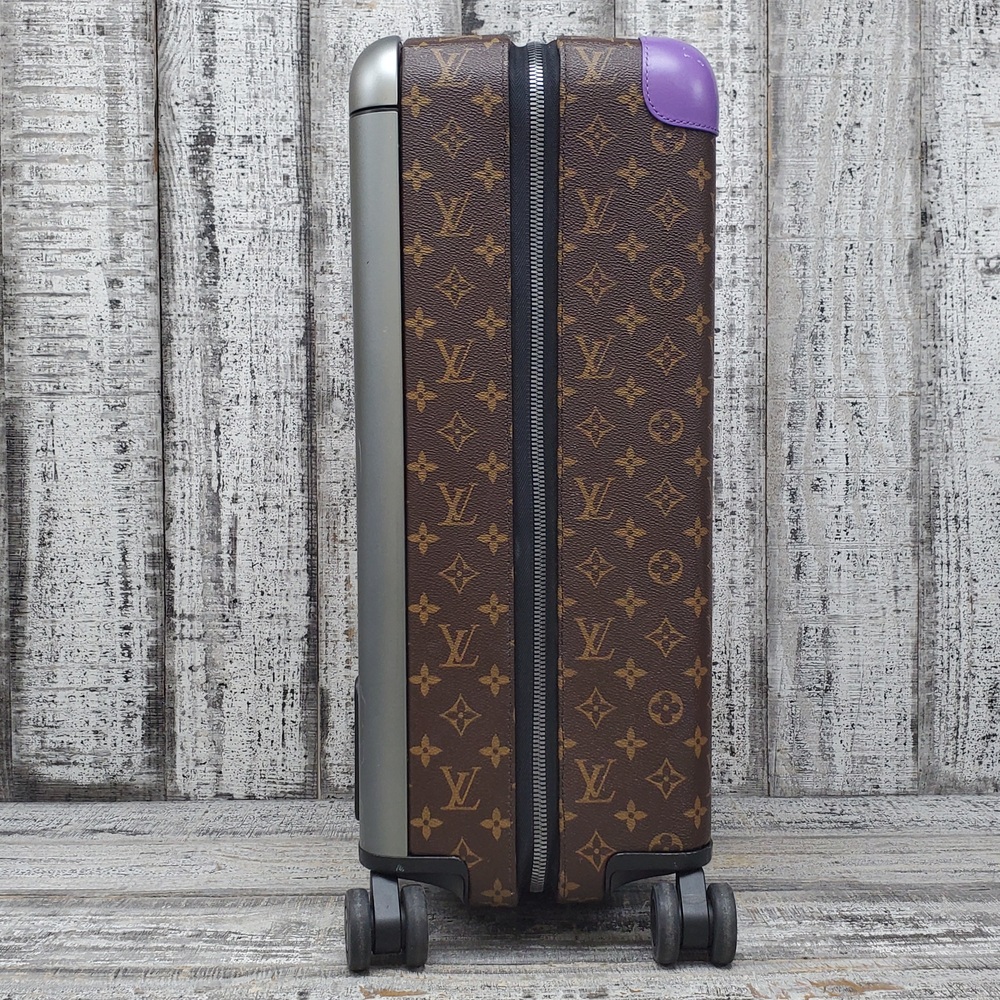A Louis Vuitton Horizon 55 suitcase featuring iconic monogram canvas paired with purple leather detailing, demonstrating some signs of wear.