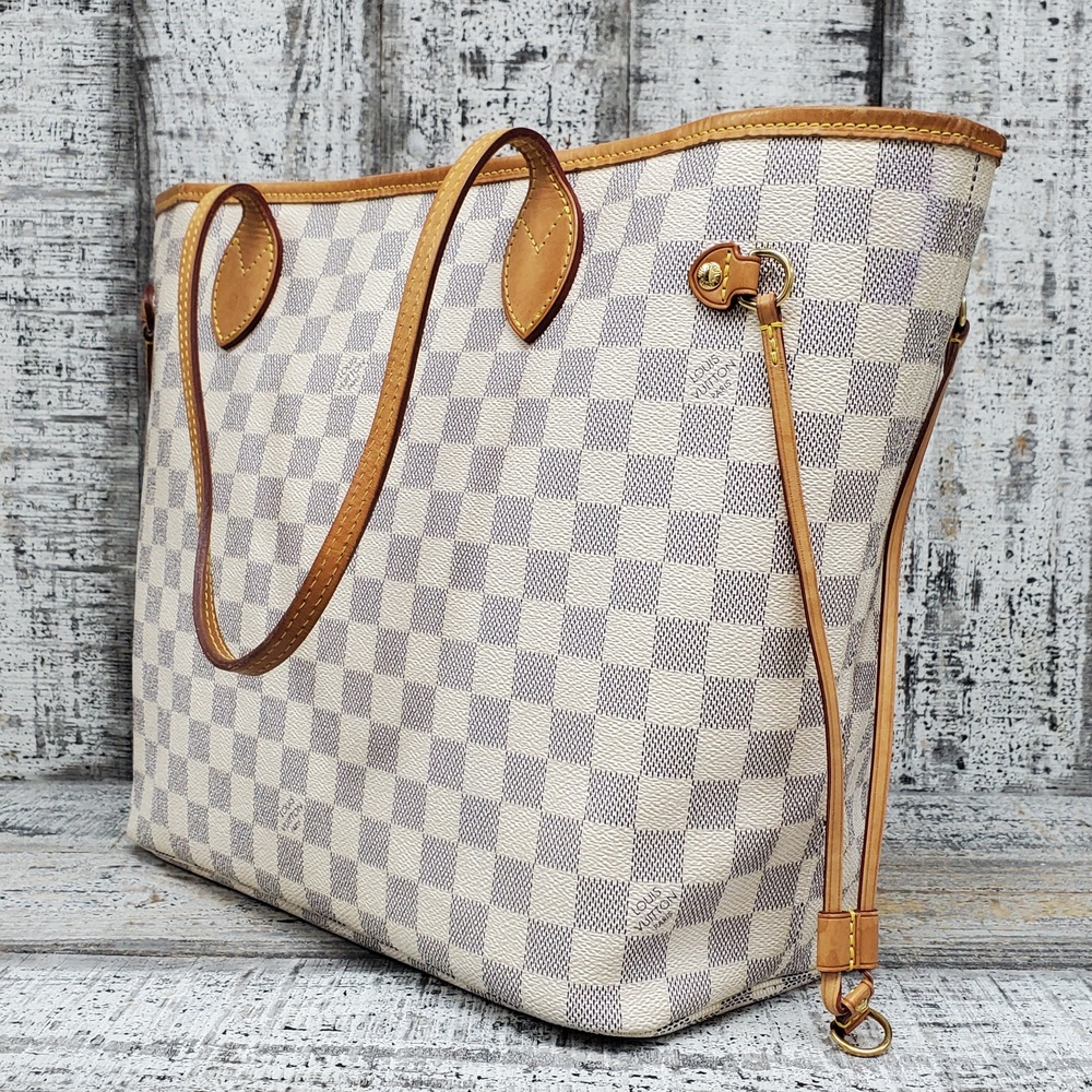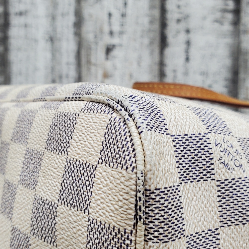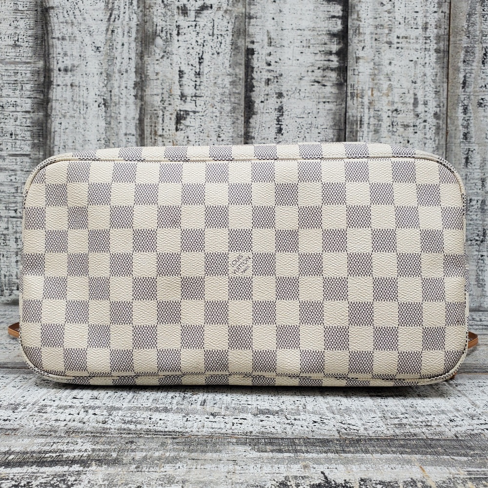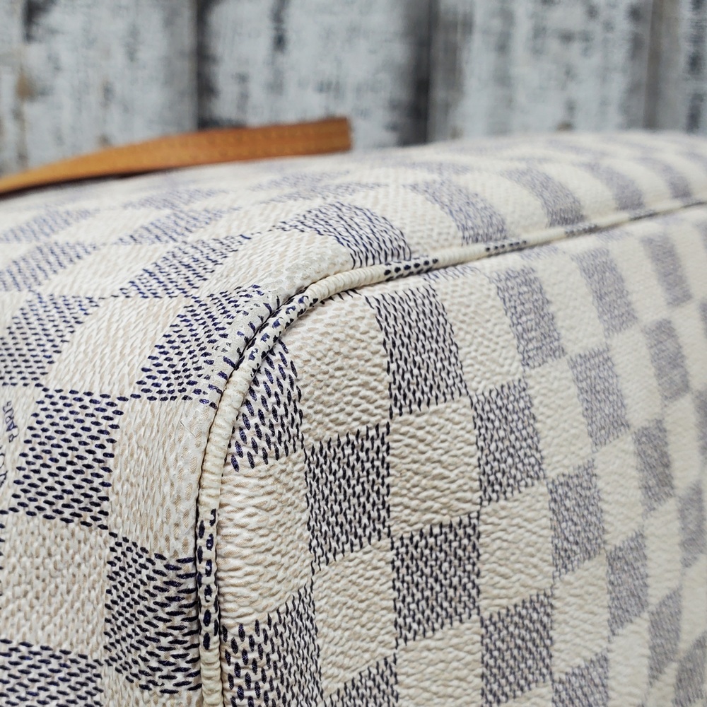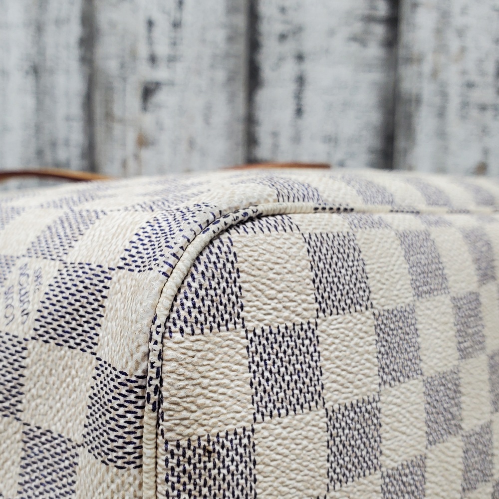 Preowned Louis Vuitton Neverfull MM in Azur Damier canvas features spacious interior, durable design, and classic style, perfect for everyday luxury and versatile use.