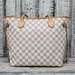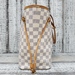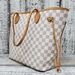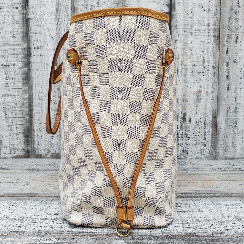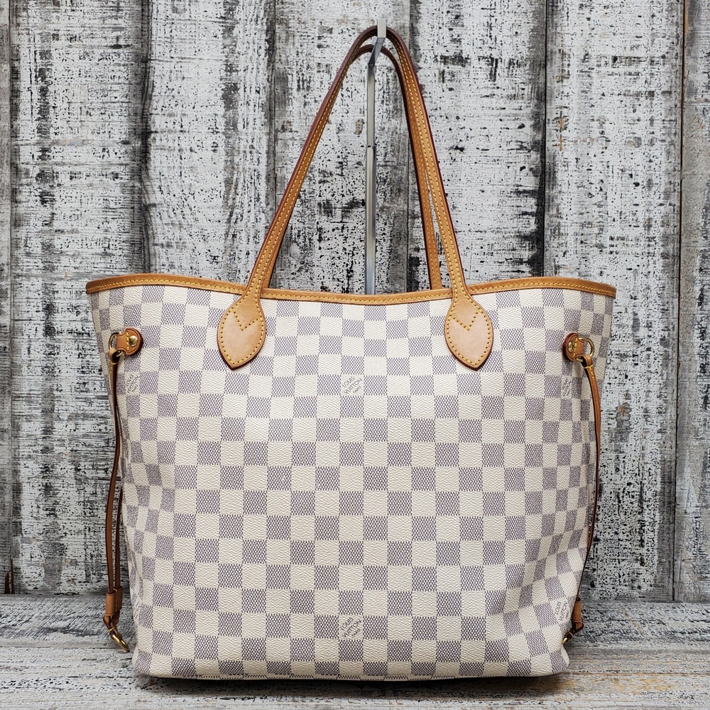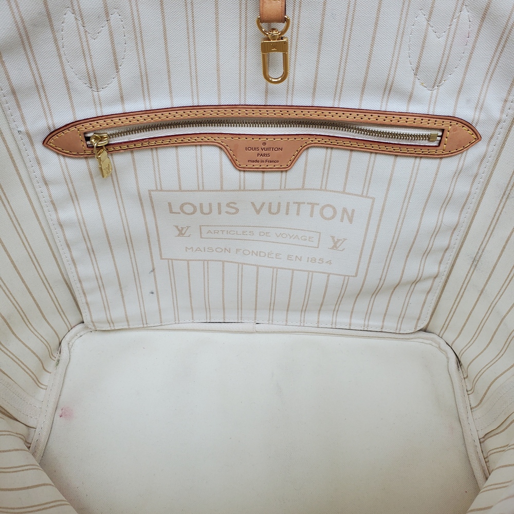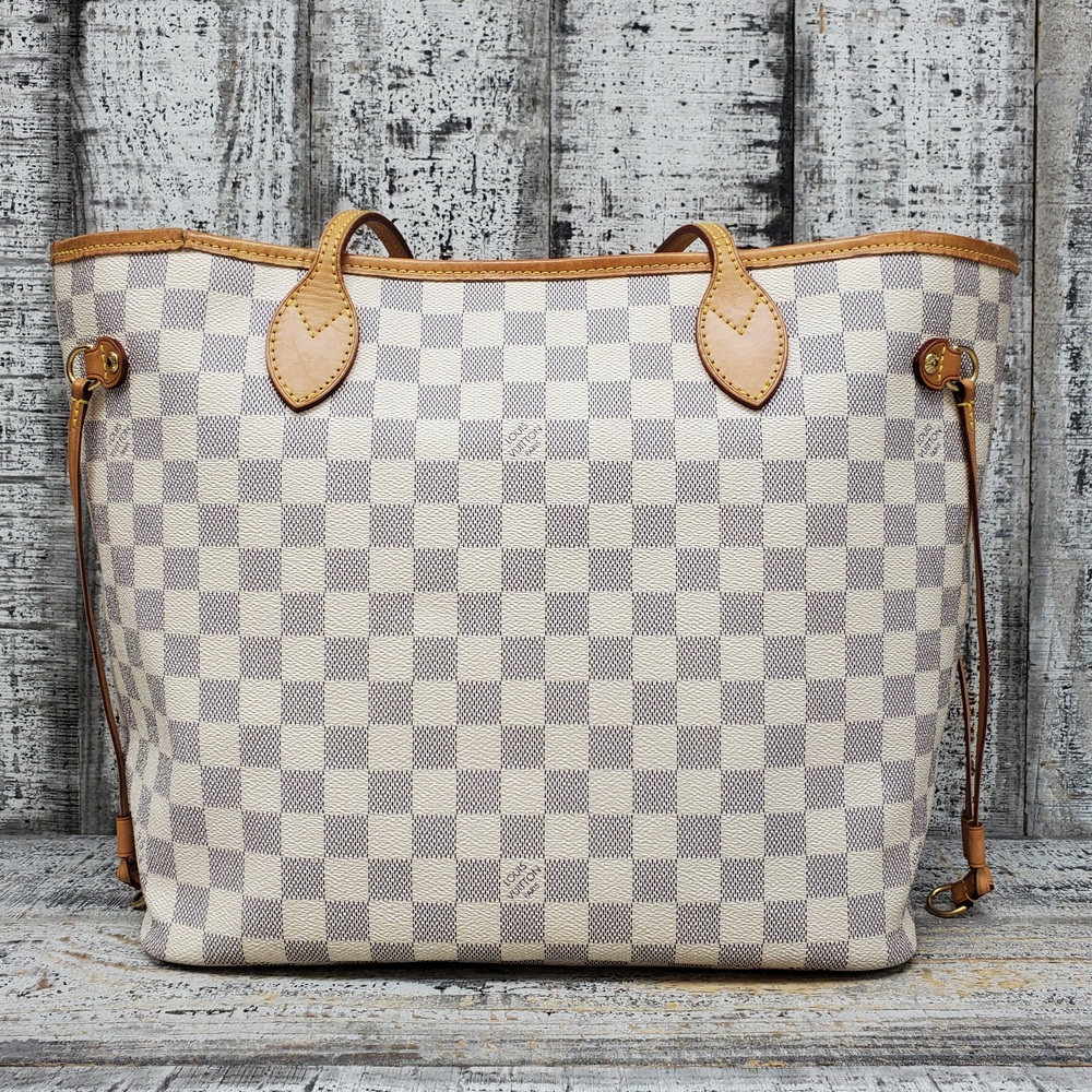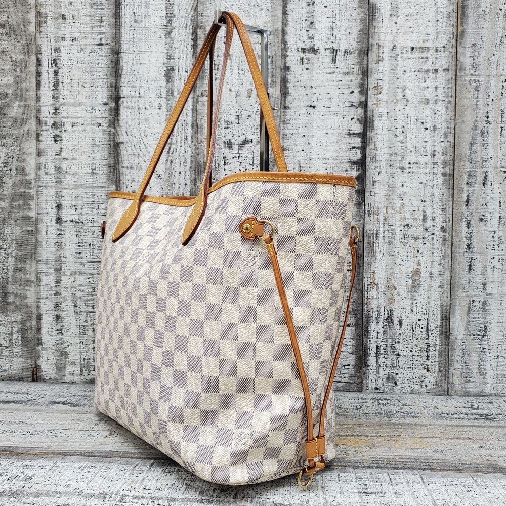 Preowned Louis Vuitton Neverfull MM in Azur Damier canvas features spacious interior, durable design, and classic style, perfect for everyday luxury and versatile use.