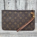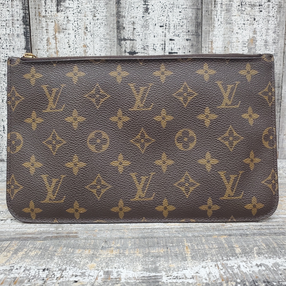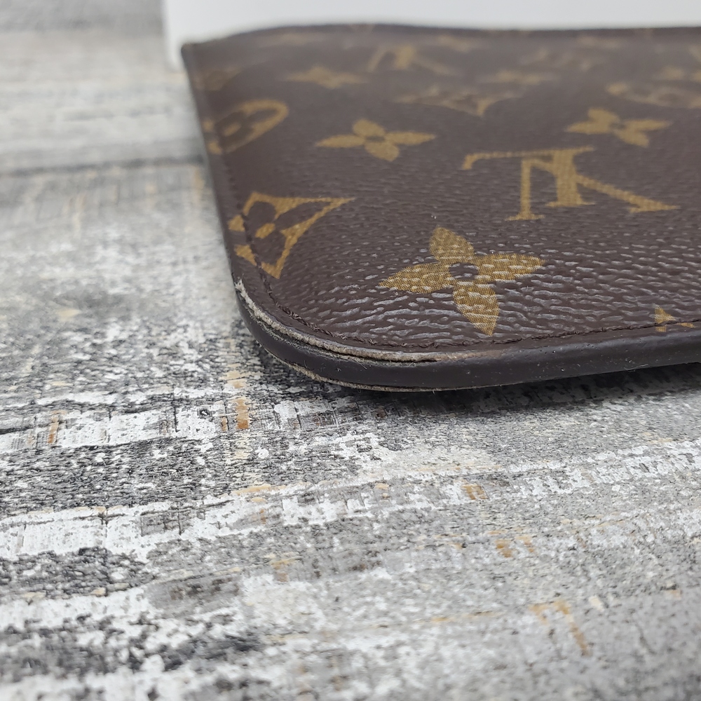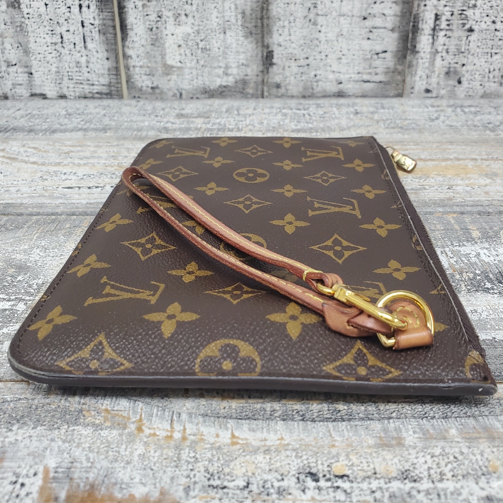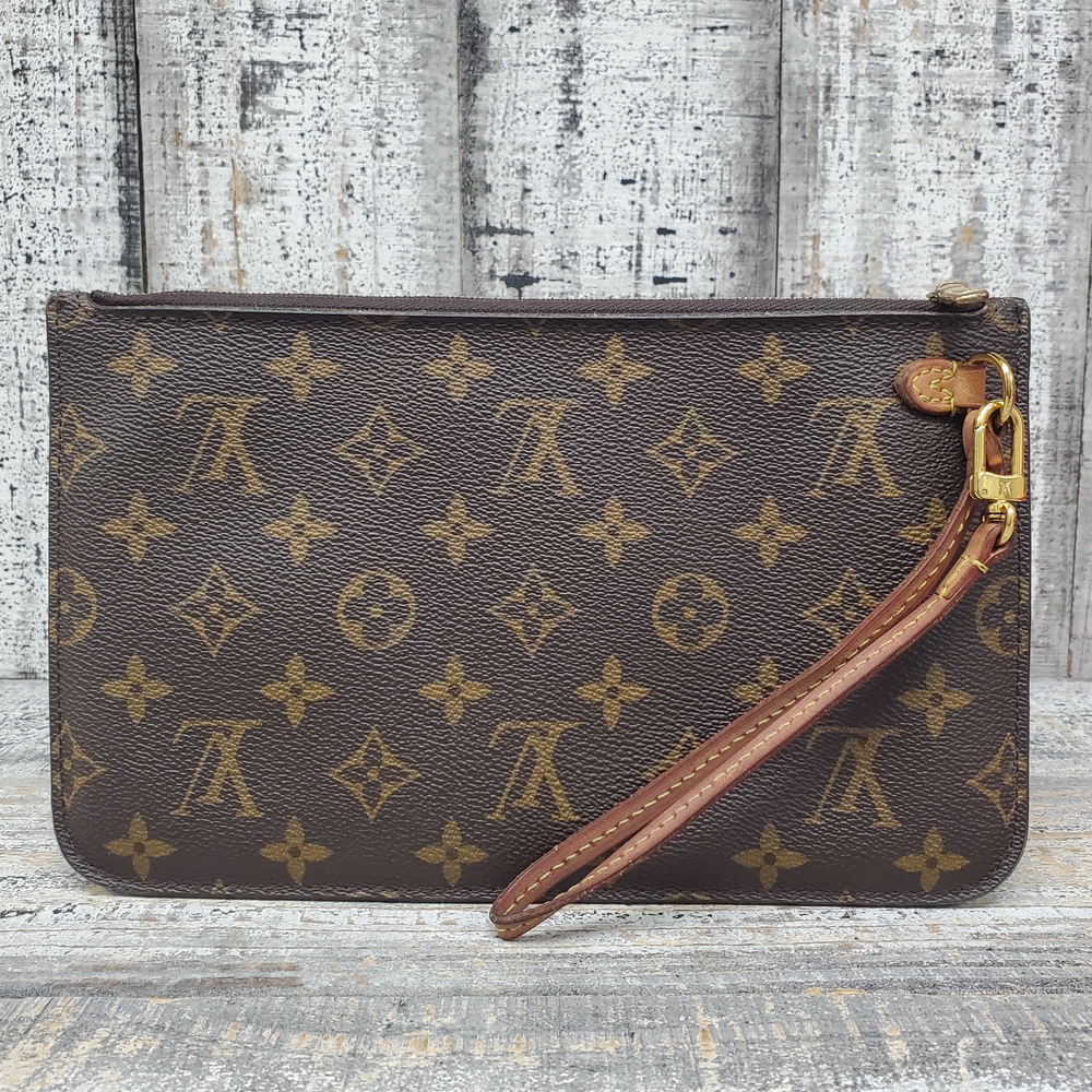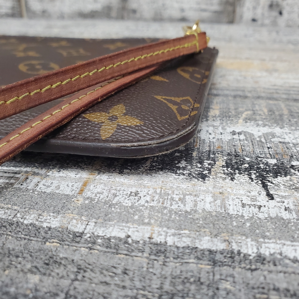 Used Louis Vuitton Monogram Pochette, shows wear but maintains classic elegance, perfect for luxury lovers with casual or formal styles.