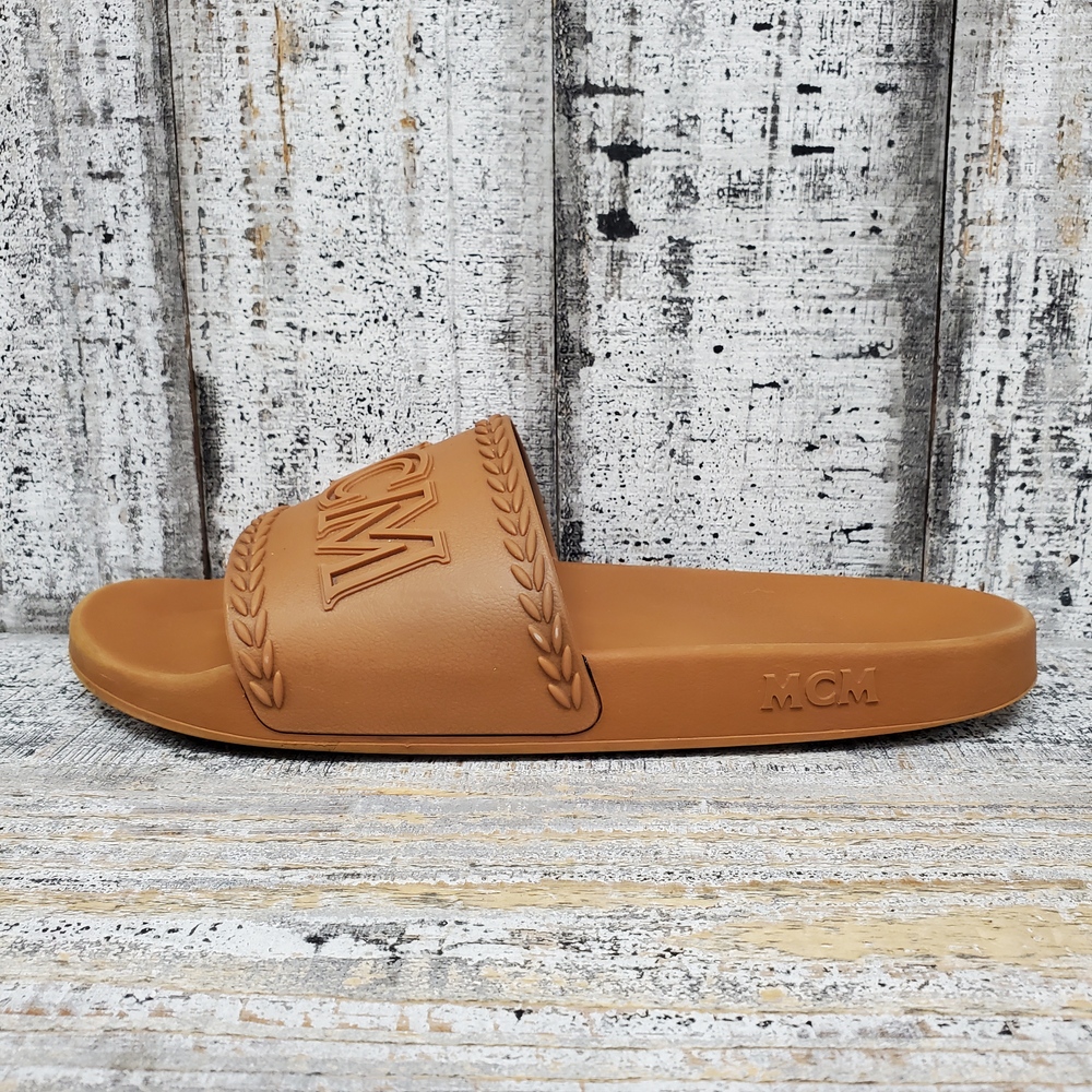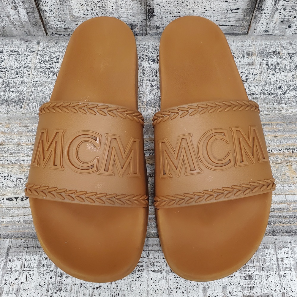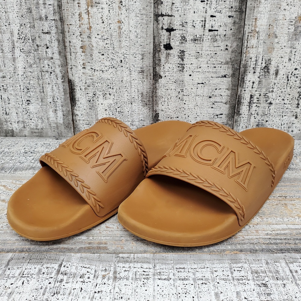 MCM Logo Slide Sandals size 44, without box. High-quality, comfortable, stylishly chic with signature logo. Ideal for casual wear. Unisex, fits true to size.