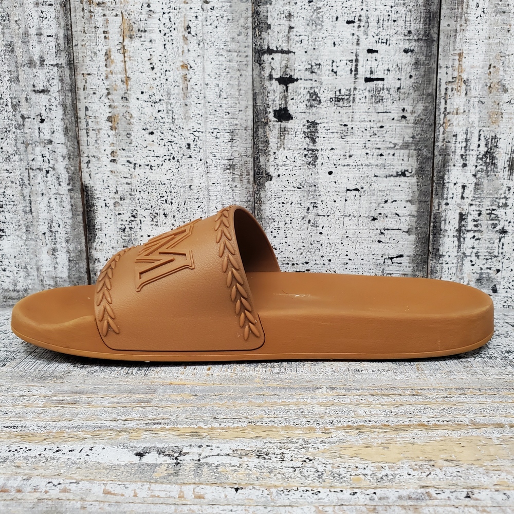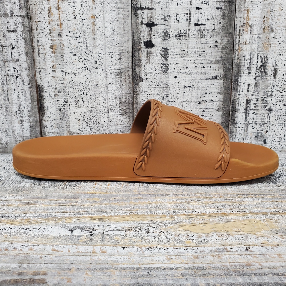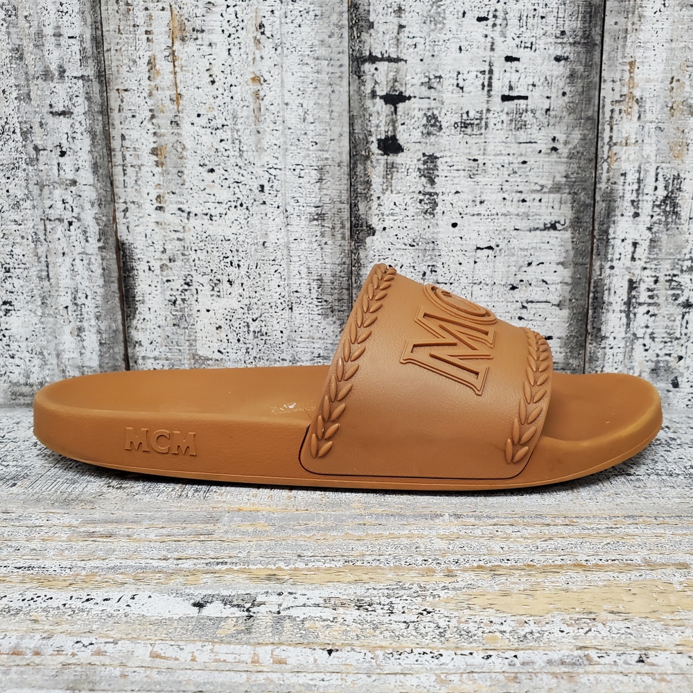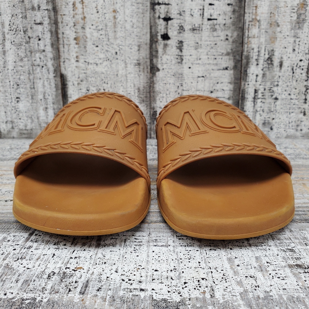 MCM Logo Slide Sandals size 44, without box. High-quality, comfortable, stylishly chic with signature logo. Ideal for casual wear. Unisex, fits true to size.