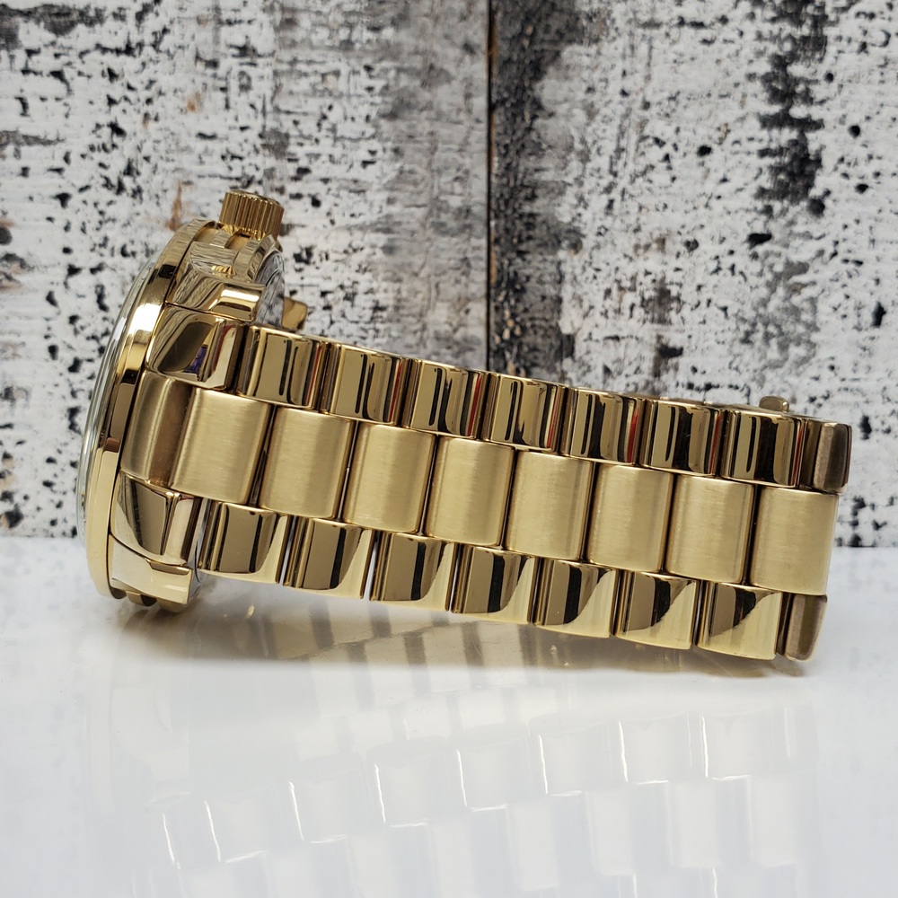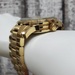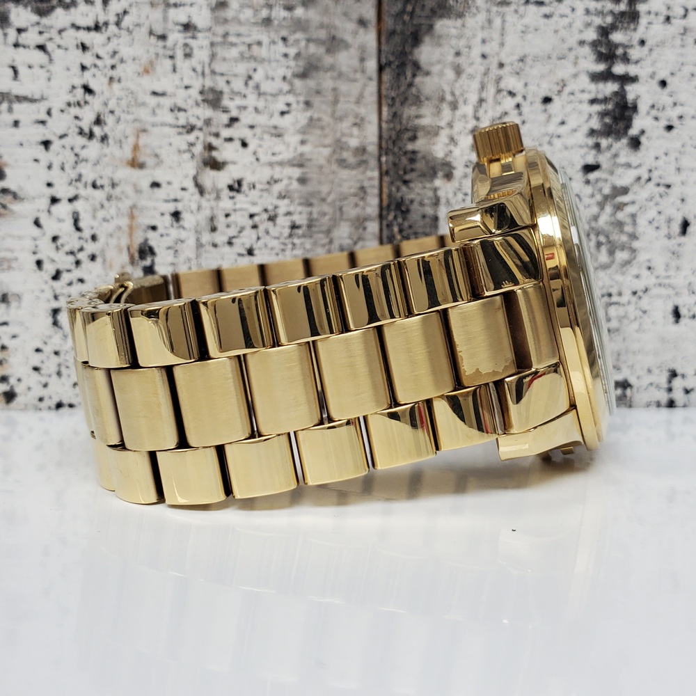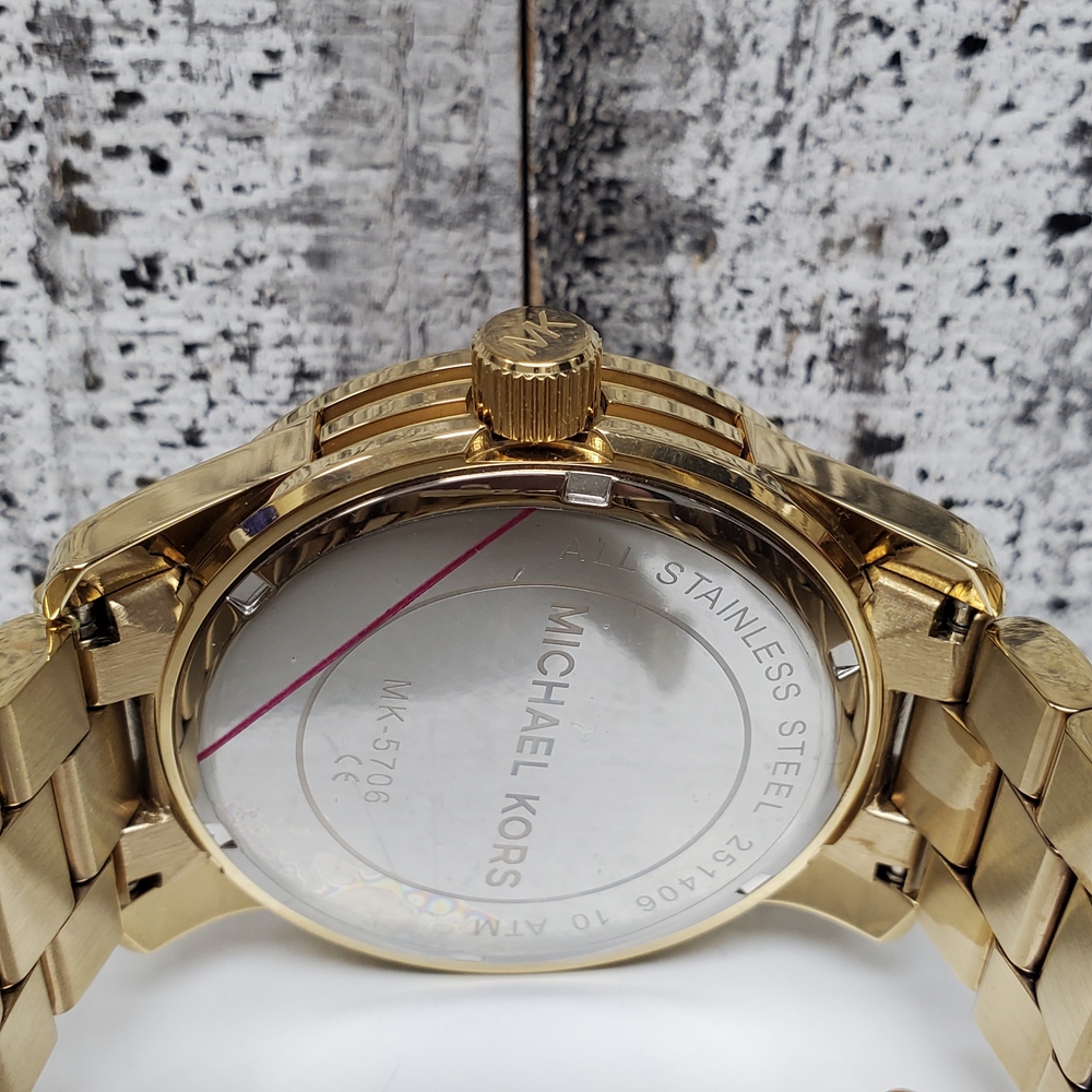 A luxurious Michael Kors MK-5706 Runway Gold Tone Watch, showcasing subtle elegance with minor signs of normal wear. Ideal accessory for sophisticated charm.