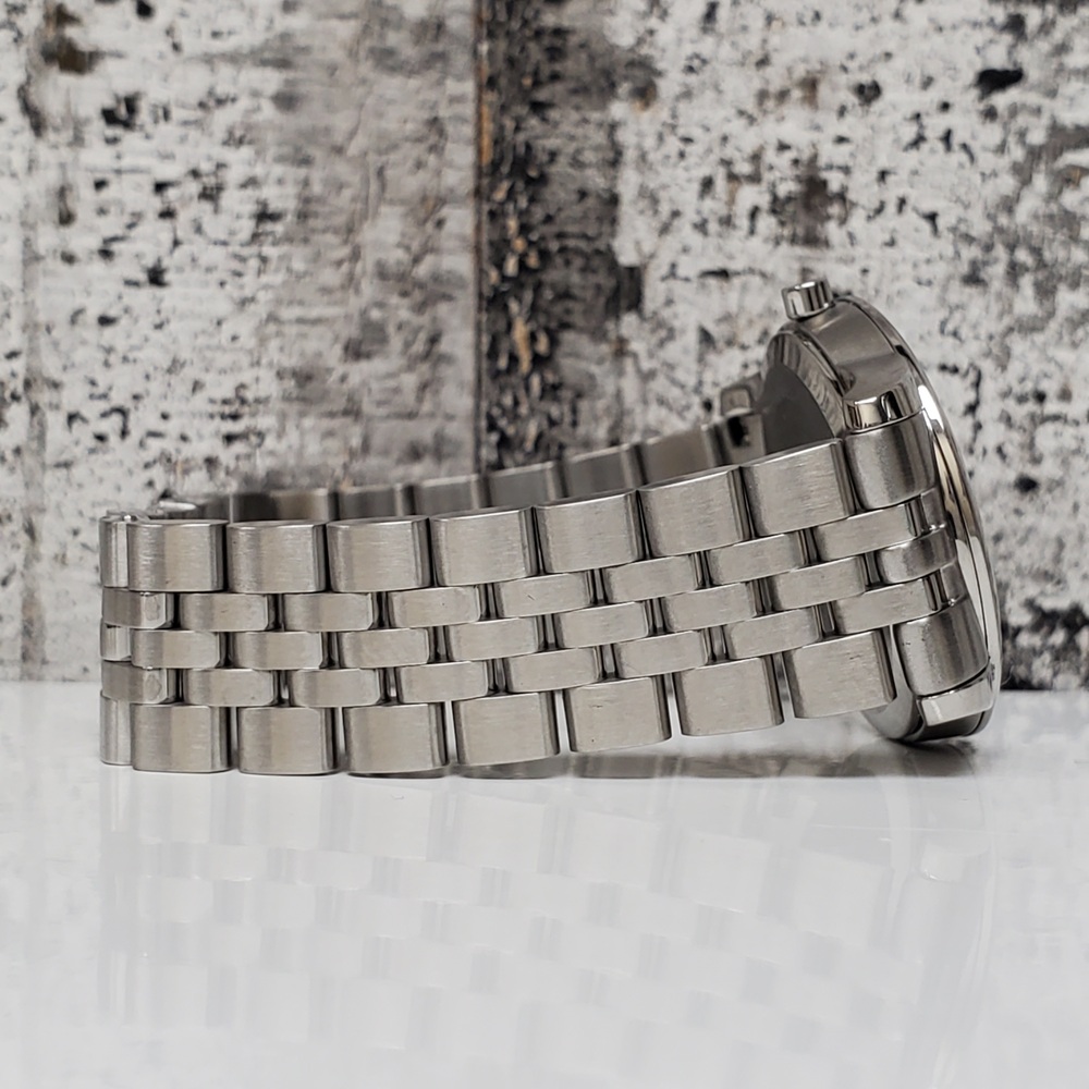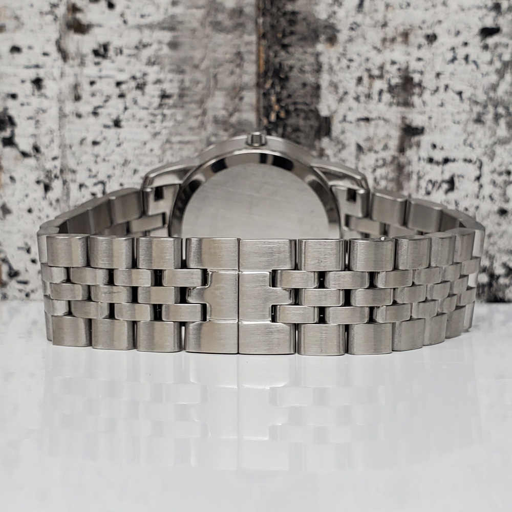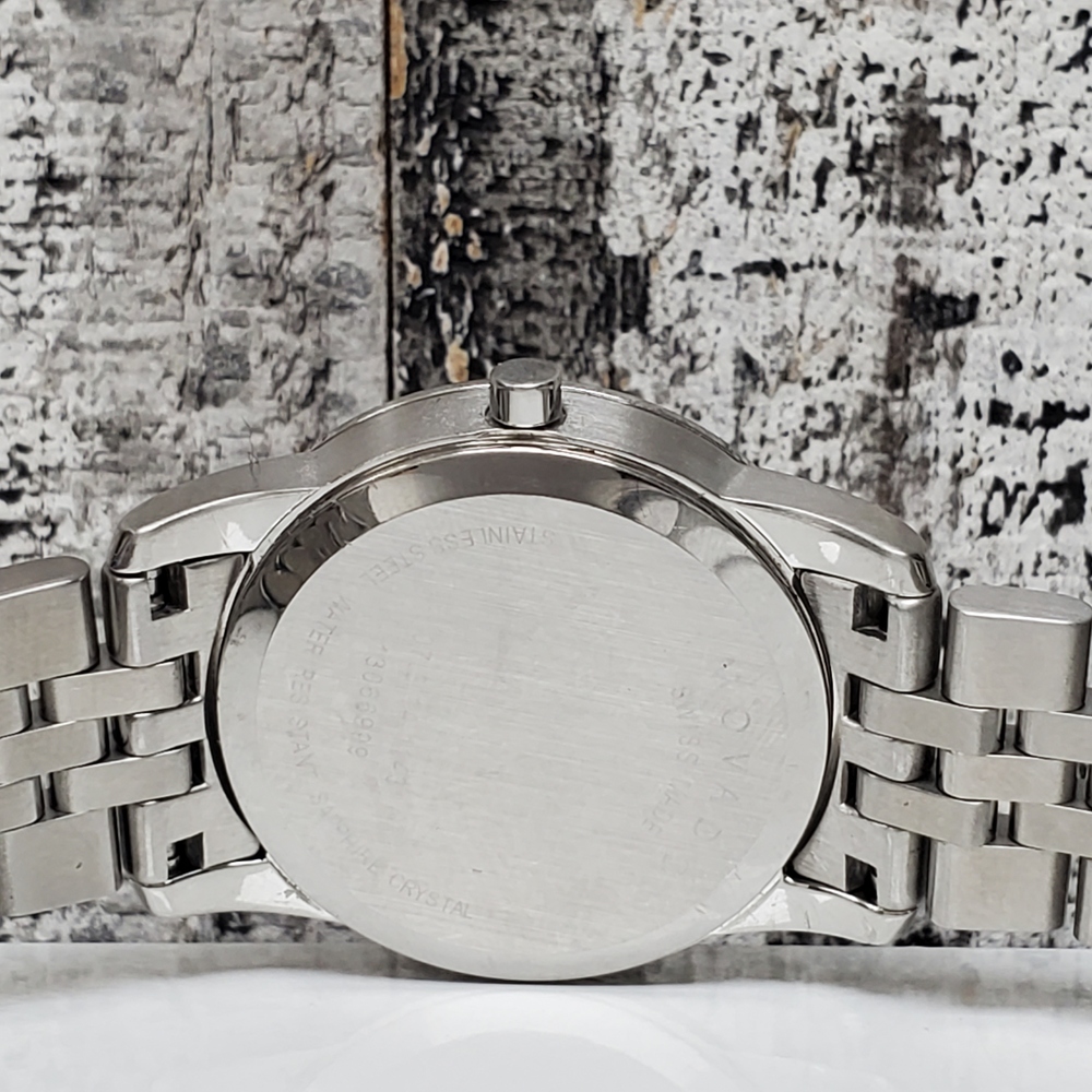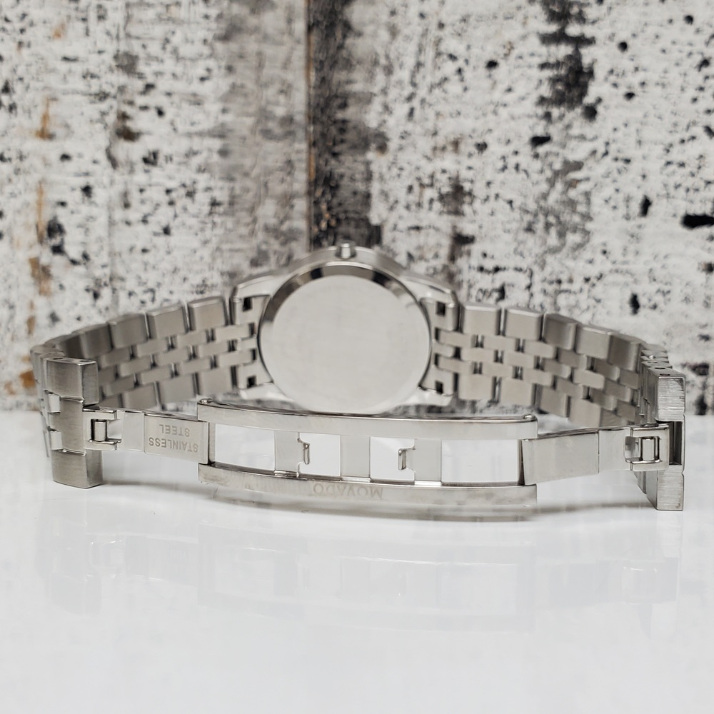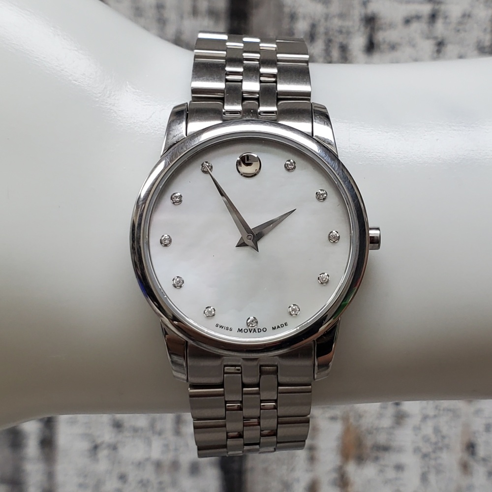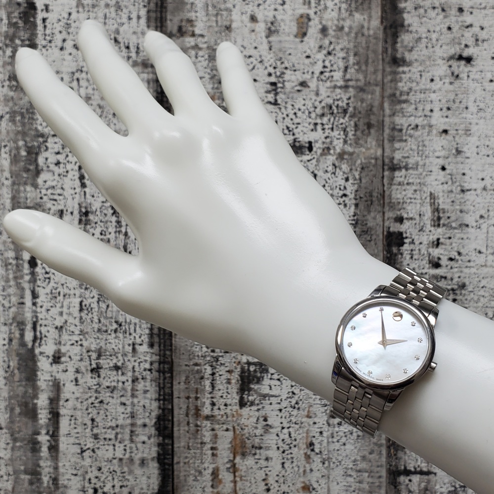 The Movado Museum MOP Diamond Dial is a refined, minimalist 28mm watch featuring a sleek silhouette and a striking diamond dial. Despite minor signs of wear and shortness on links, its elegance remains intact, complementing any wardrobe. Perfect for those appreciating understated luxury.