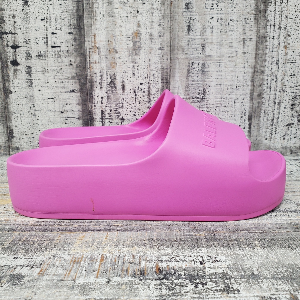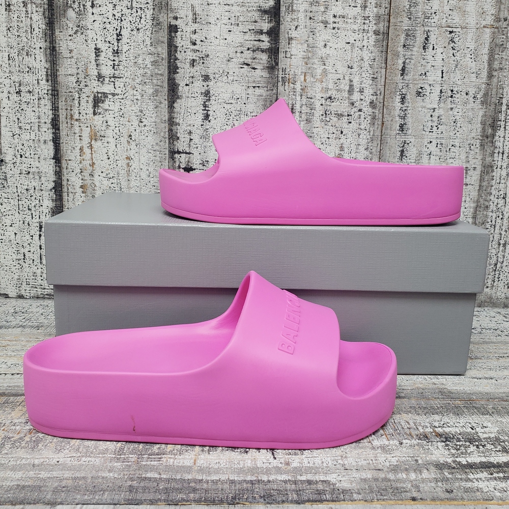 Unworn, size 11W pink Balenciaga slippers, delivered in the original box. Exquisite, luxurious footwear with stylish, comfortable design and premium quality, perfect for home wear.