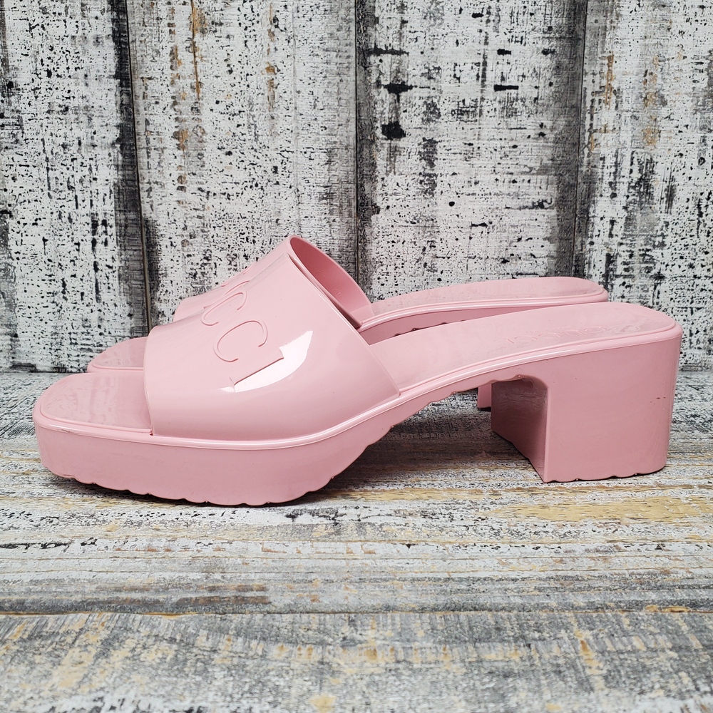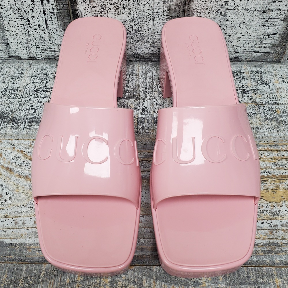 Elegant size 40 pink Gucci rubber slippers, offering superior comfort, with iconic branding. Comes in original box for added luxury. Perfect for stylish, casual wear.