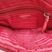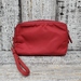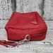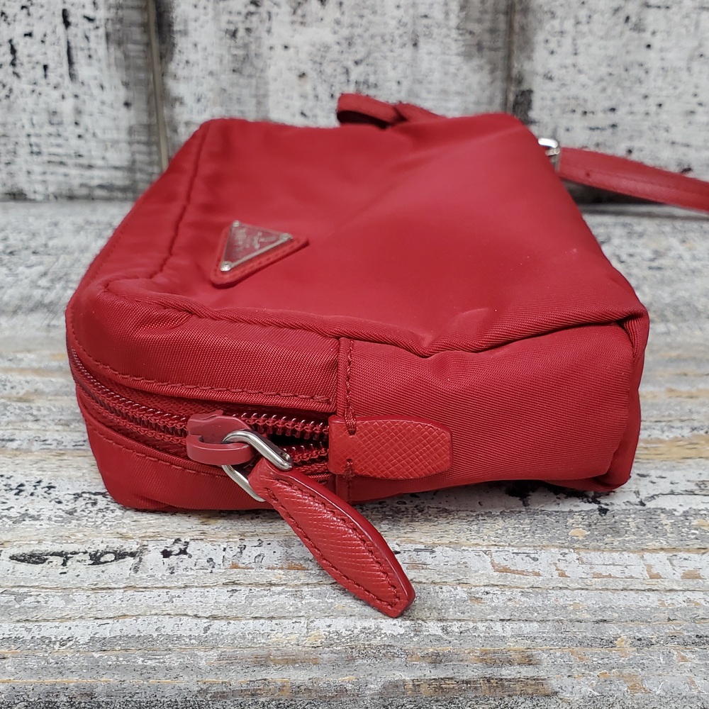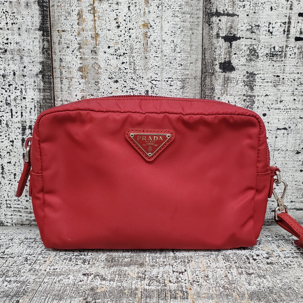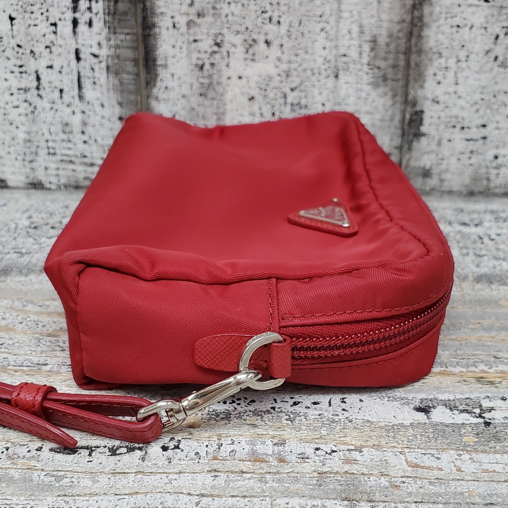 A used, red Prada Re-Nylon pouch for women, small in size, maintaining stylish appeal despite previous use. Ideal for carrying essential items.