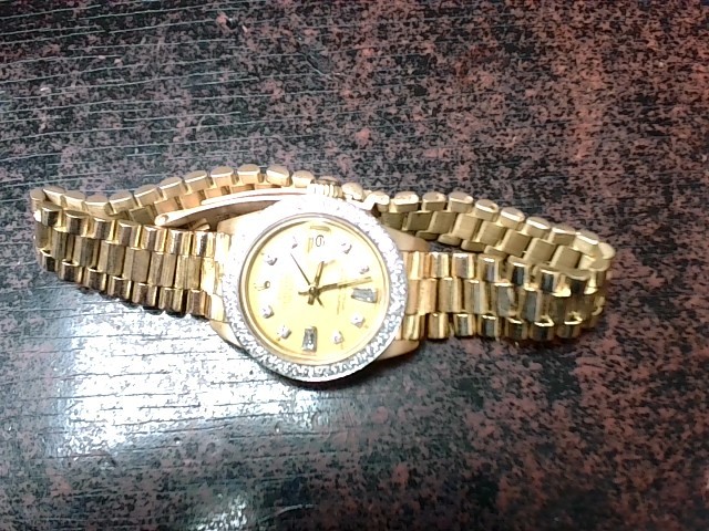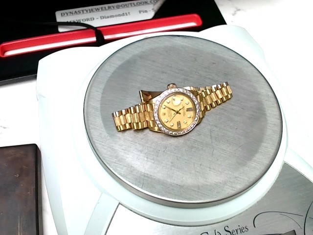 Dept:J2 Gold 18kt 44.90dwt '83 Rolex 6927 26mm Lady Datejust est. .85ctw AM Dia Bez + est. .25ctw AM Dia Dial 18K YG w/ Bark Finish Band 44.40dwt SN: - NOT GUARANTEED WATERPROOF w/ AFTERMARKET BEZEL Rolex Watch 6927 SN: