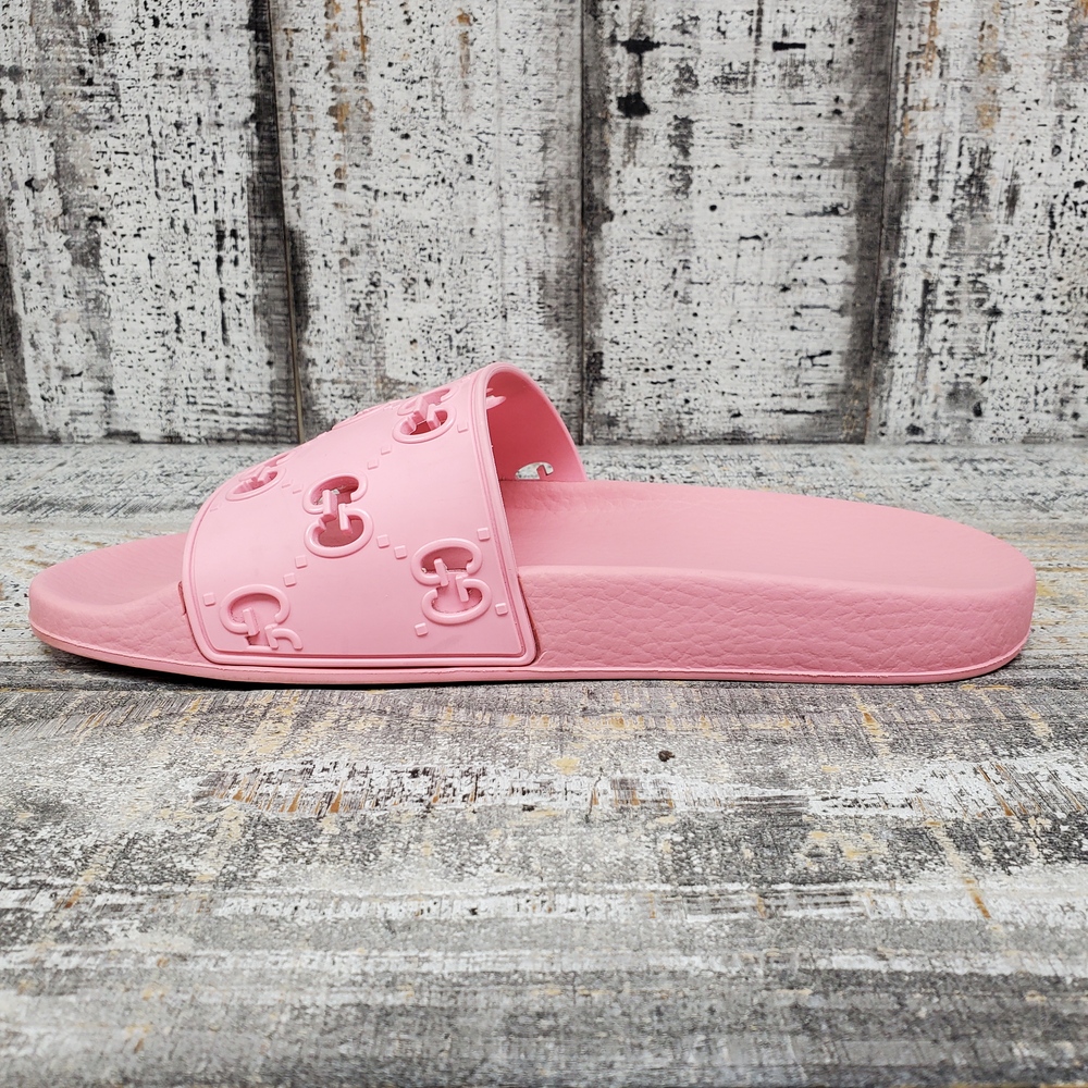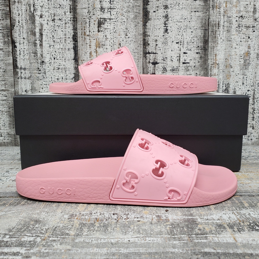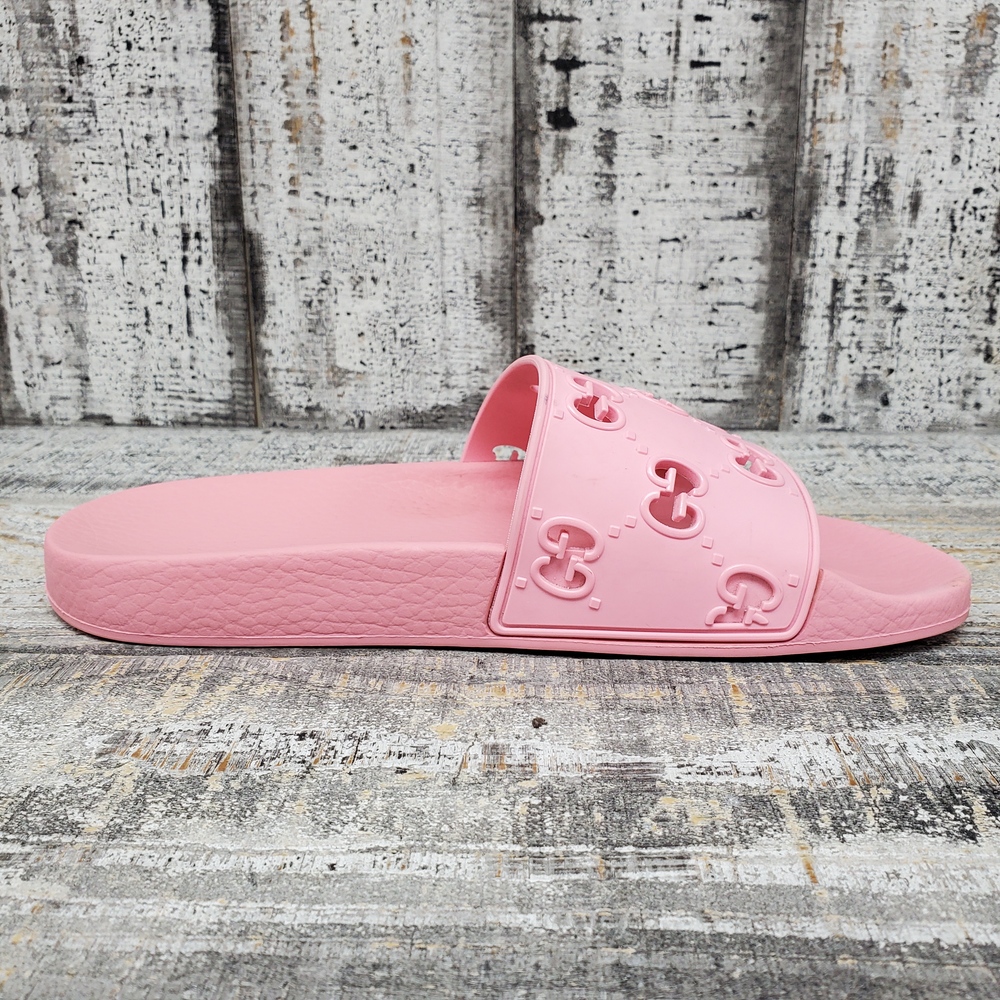 A pair of size 39 pink sandals, featuring rubber upper and sole, adorned with a GG design. Comes with a box. Perfect for casual wear.