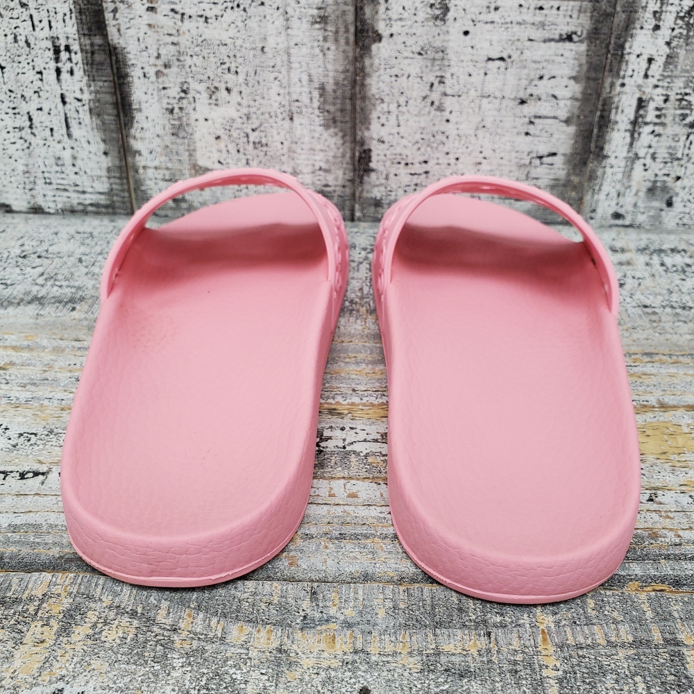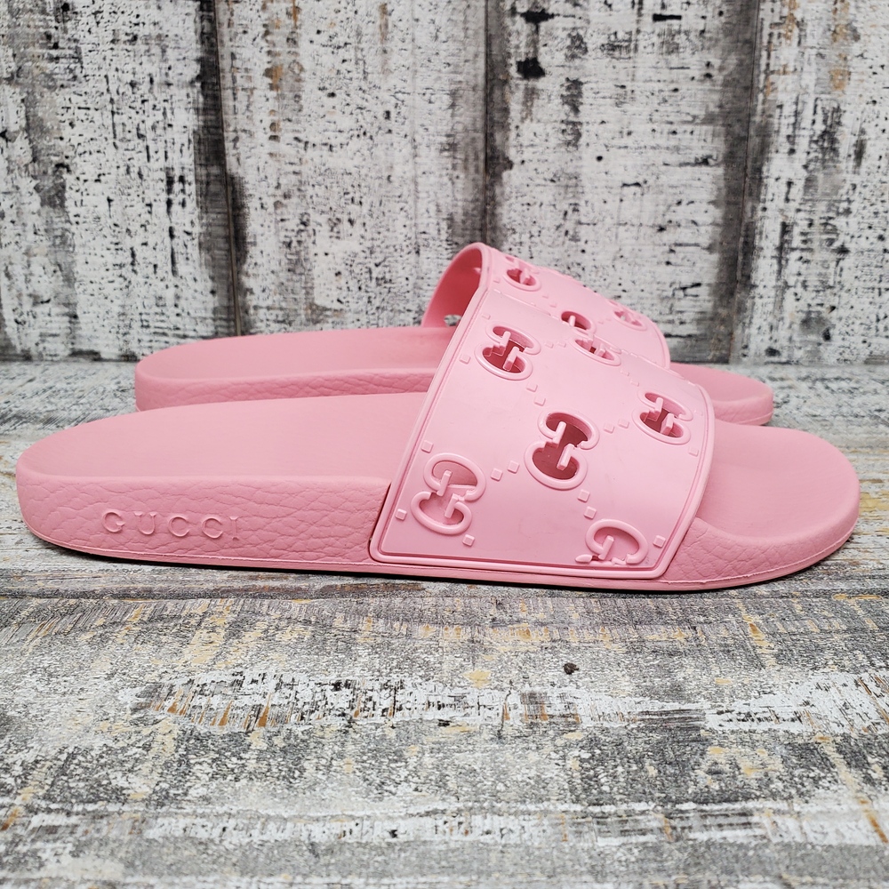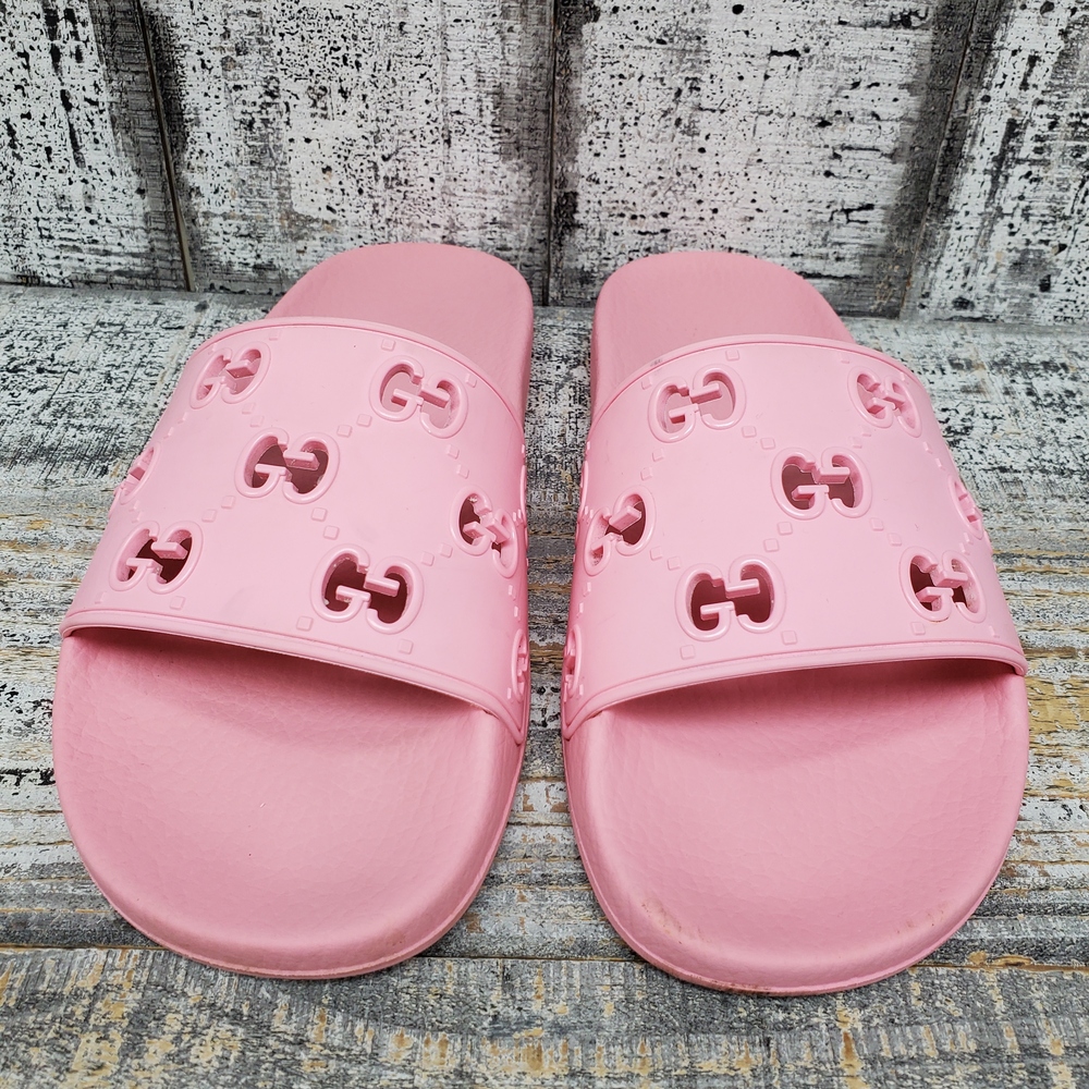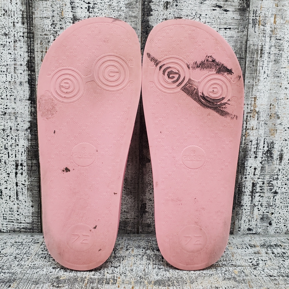 A pair of size 39 pink sandals, featuring rubber upper and sole, adorned with a GG design. Comes with a box. Perfect for casual wear.