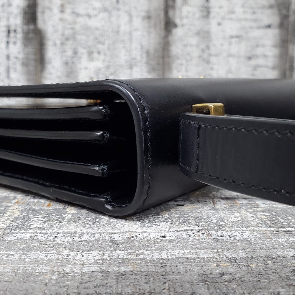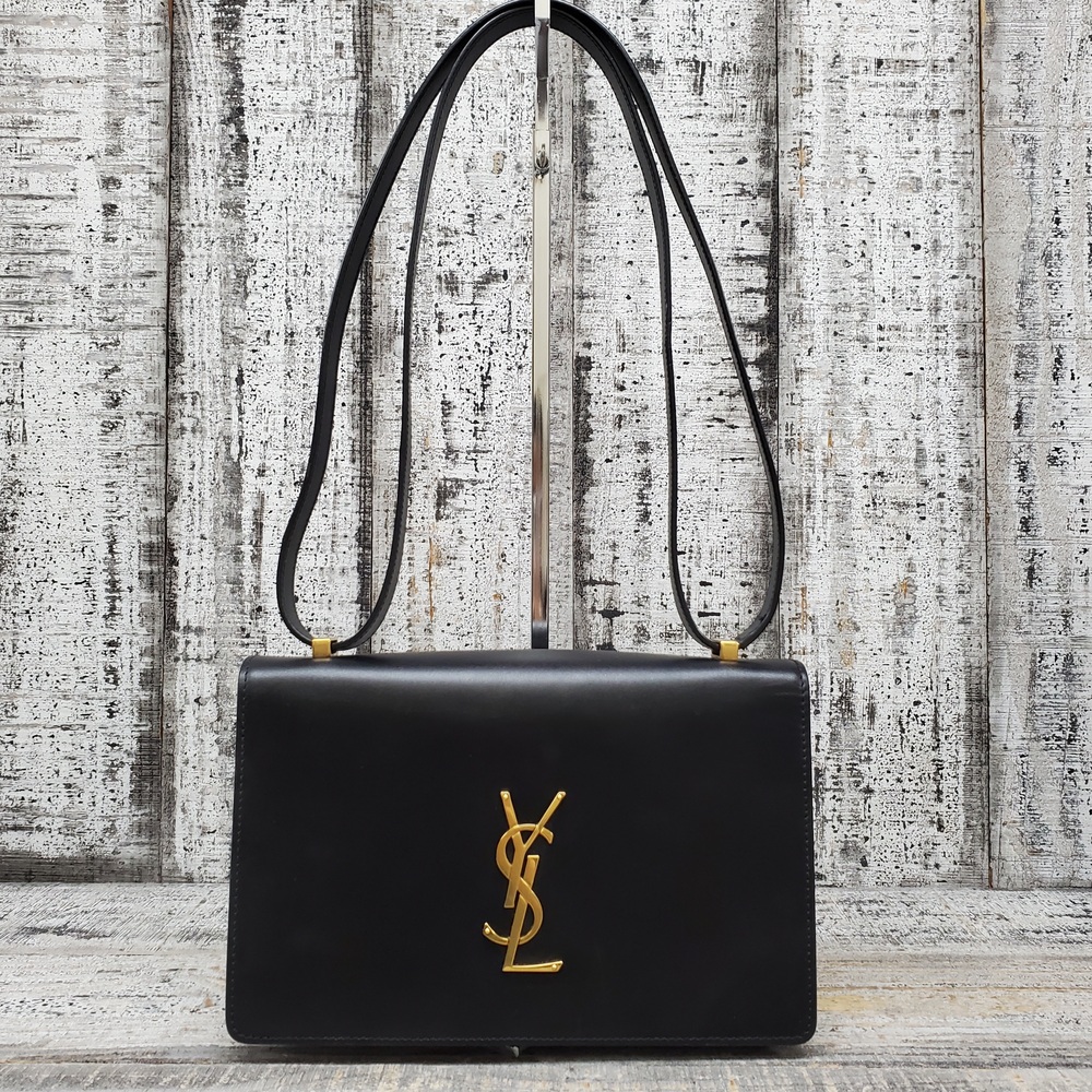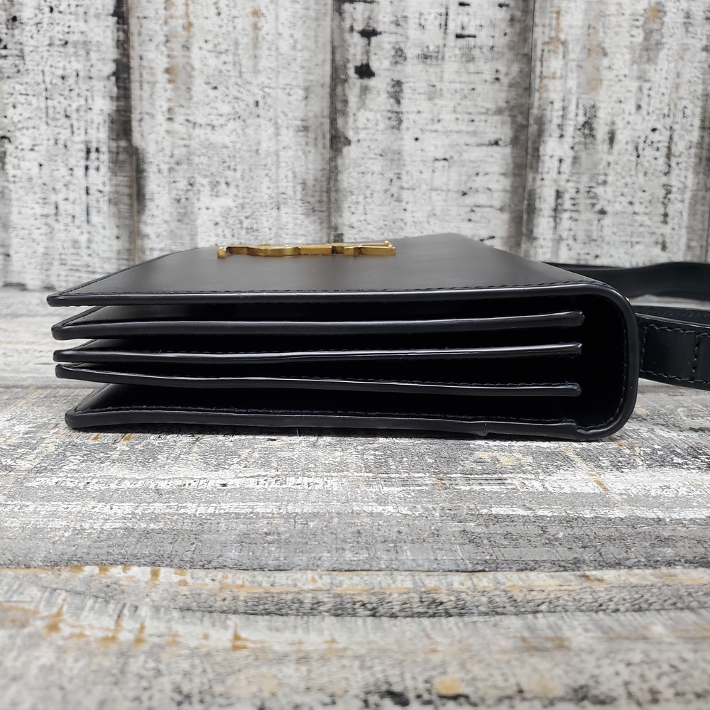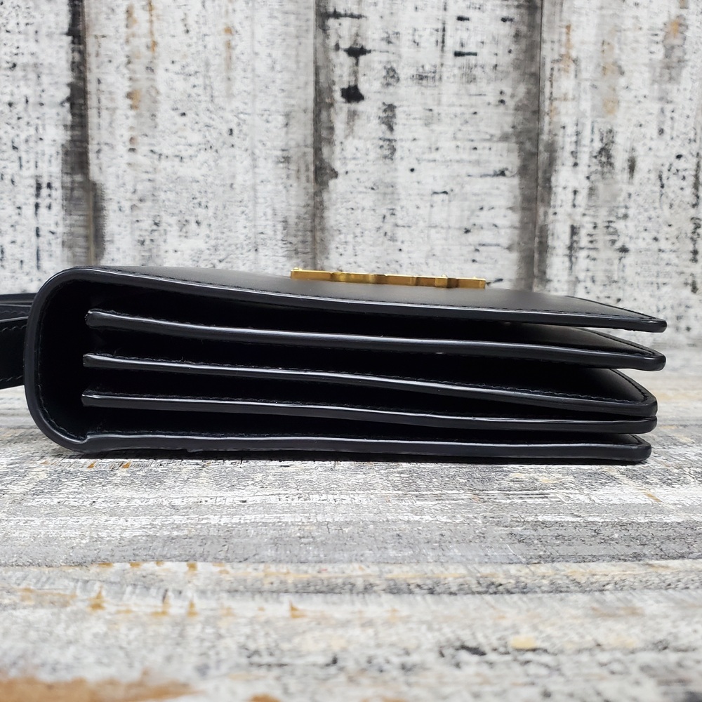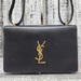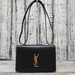 A sleek, small-sized Saint Laurent Dylan shoulder bag, elegant in black calfskin, adorned with iconic monogram hardware. Features detachable strap for versatile styling.