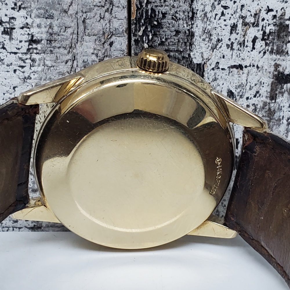 On sale: 35mm vintage Rolex with a 14K gold-filled case and a 1520 movement. This classic timepiece comes with a leather band. Please note, the crown, clasp, and strap are not original.