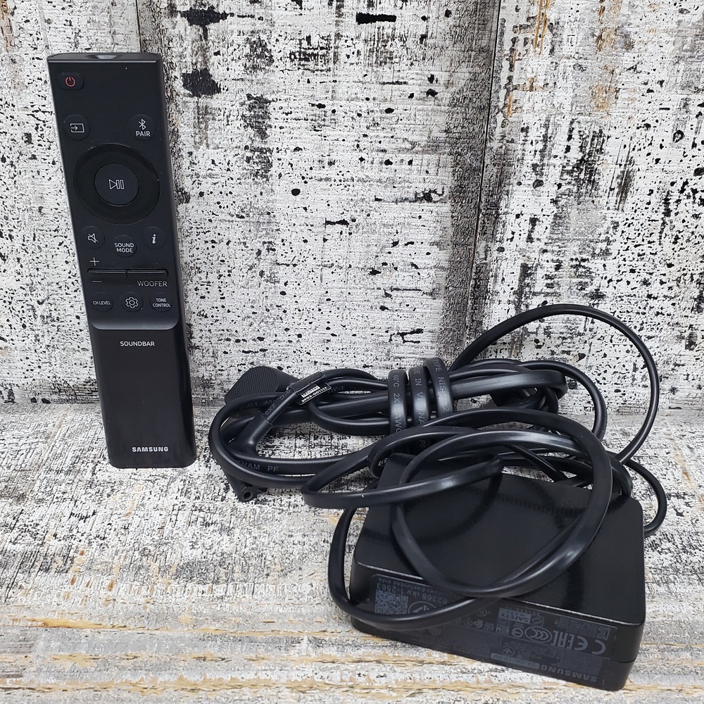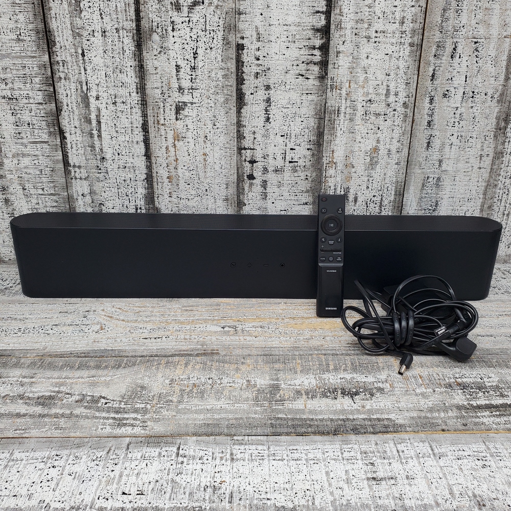 A Samsung S800D soundbar with 3.1.2 channels, wireless Dolby Atmos Audio technology, includes a remote and power cord, enhancing your audio experience.