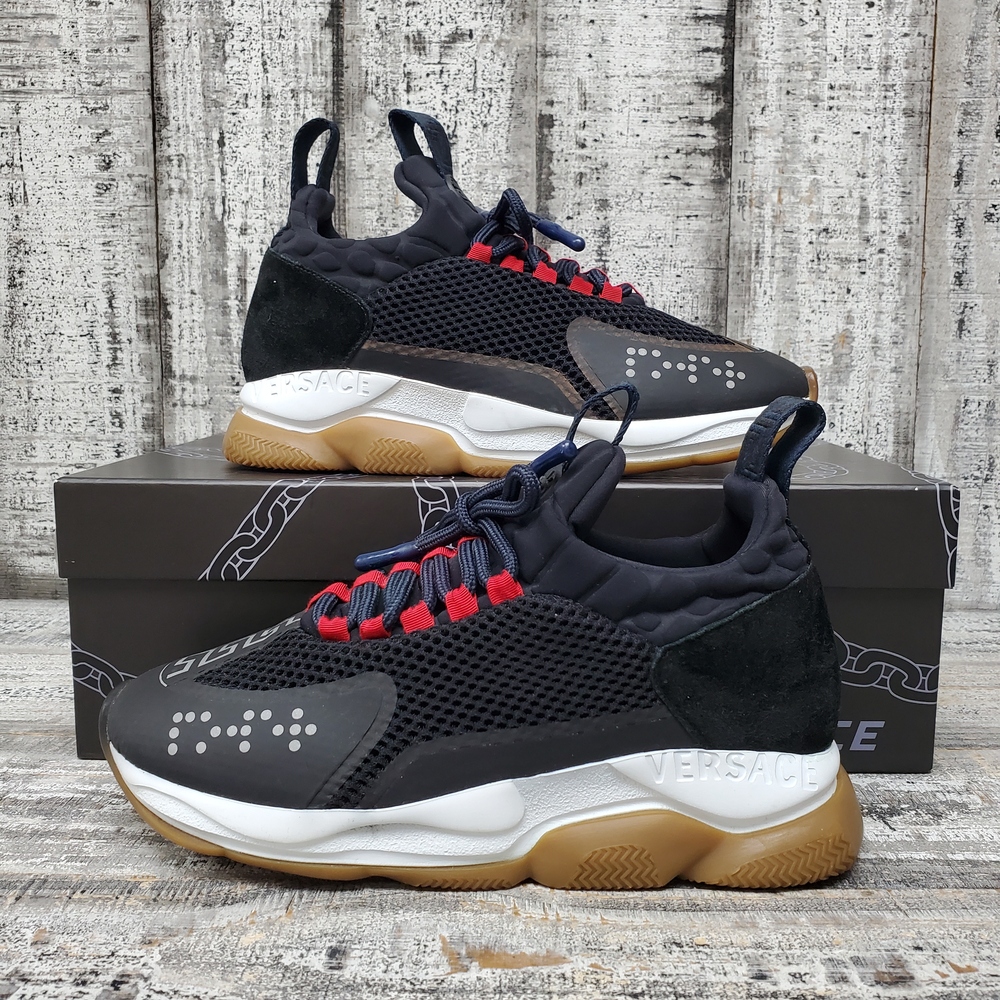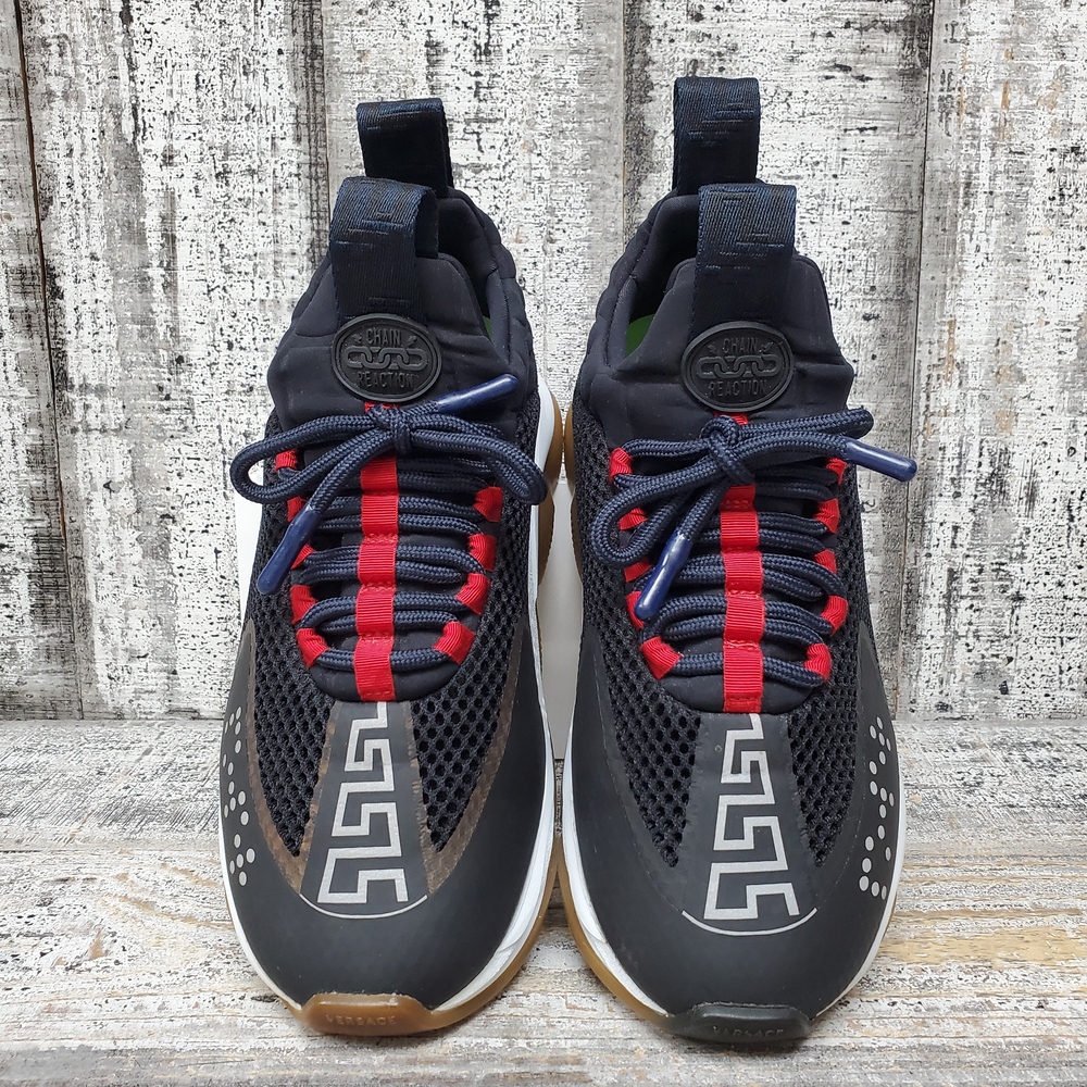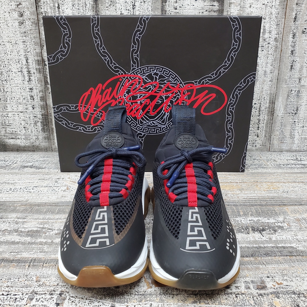 Pre-owned Versace Chain Reactions sneakers, size 39.5. Good condition with original box. Characterized by distinctive design, comfort, and high-quality materials.