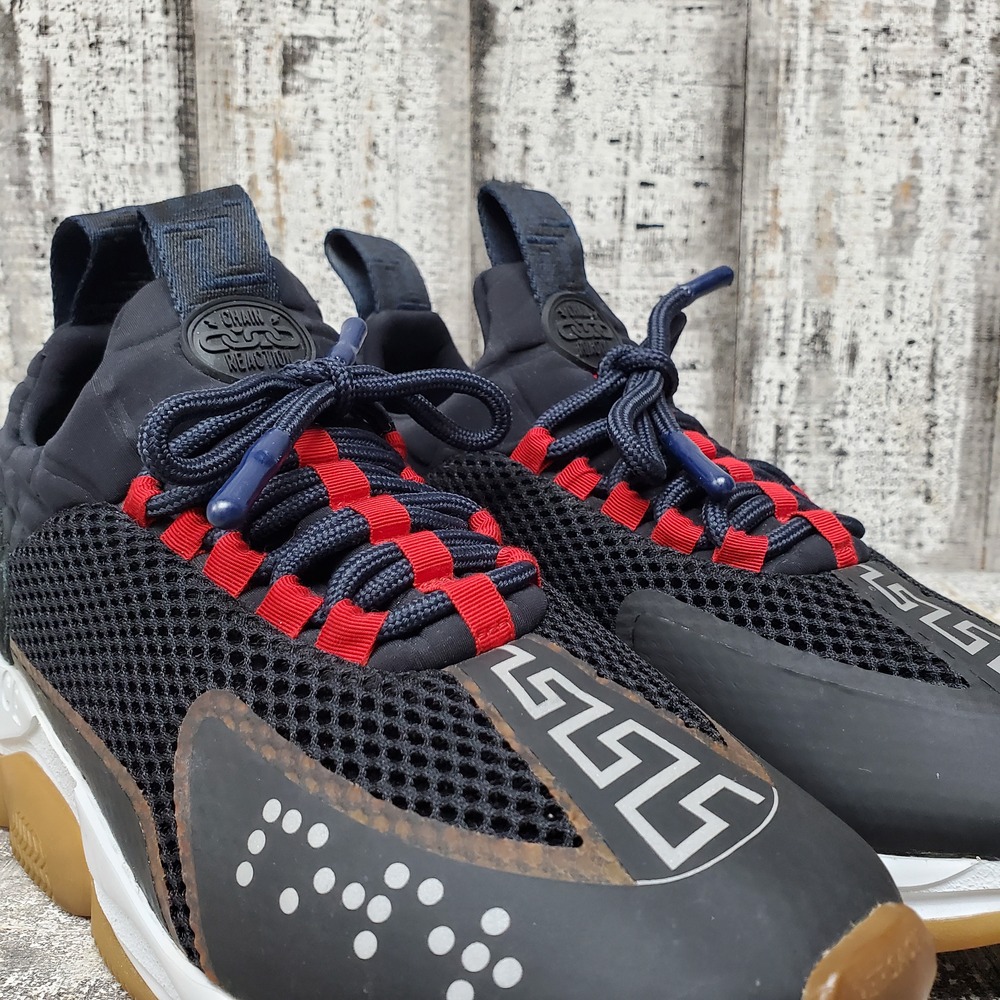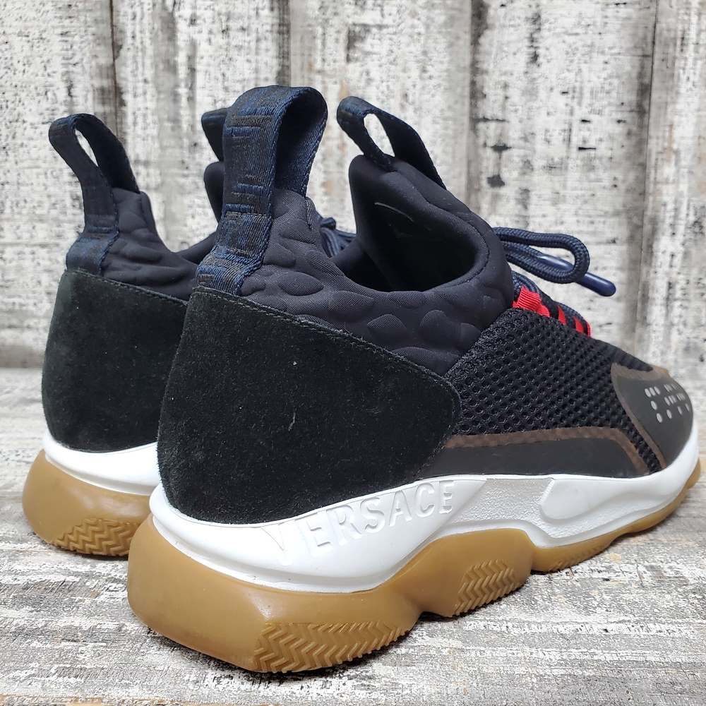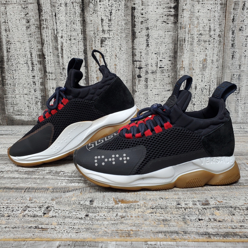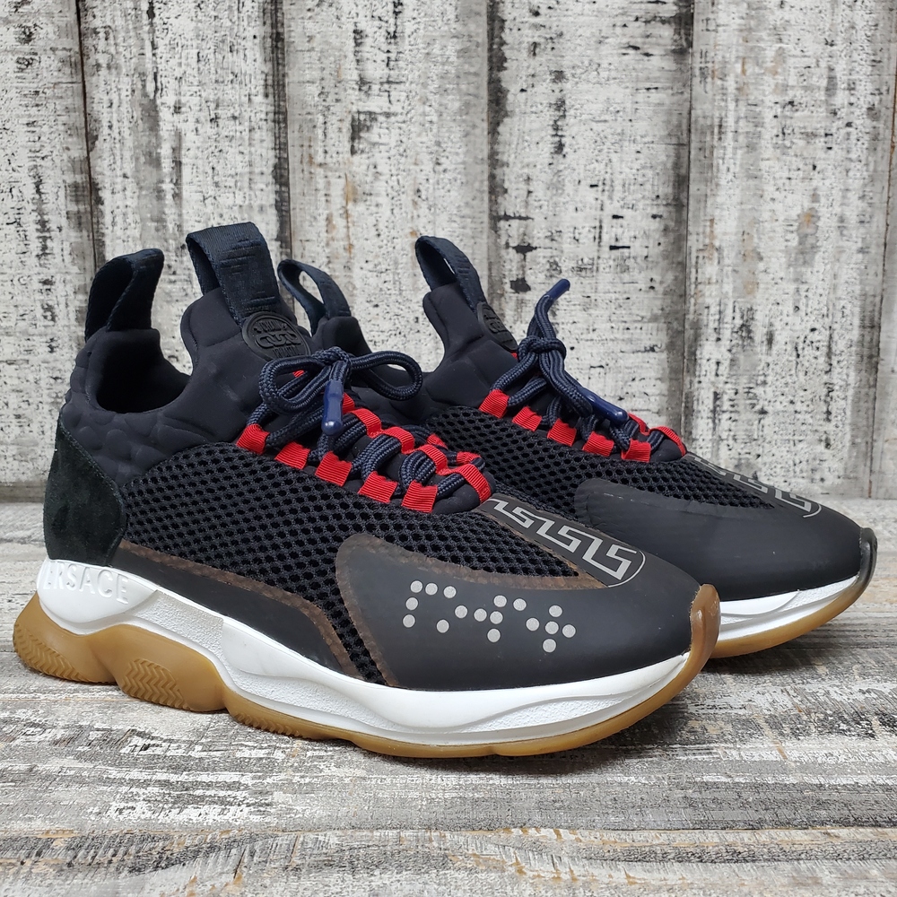 Pre-owned Versace Chain Reactions sneakers, size 39.5. Good condition with original box. Characterized by distinctive design, comfort, and high-quality materials.