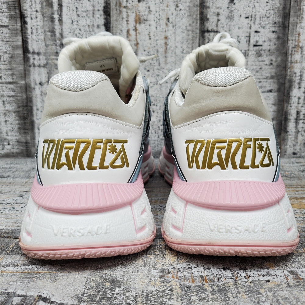 Used Versace Tessuti Nabuck shoes, size 41, in original box. Show signs of wear but still maintain their stylish, high-quality design.